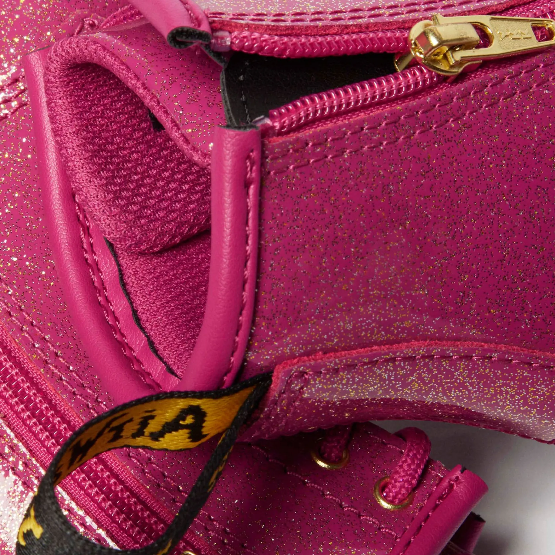 The original DM’s boot — glittered for tiny feet. This revamped design is built for personalities that shine early on. Using Nebula Glitter, a classic patent leather with a high-shine finish and a sparkle effect. The silhouette has all the signature 1460 8-eye boot features you’d expect: a scripted heel loop and yellow faux welt stitching. Along with shiny silver eyelets, an inside zip and a cemented smoke DMS Kids sole.