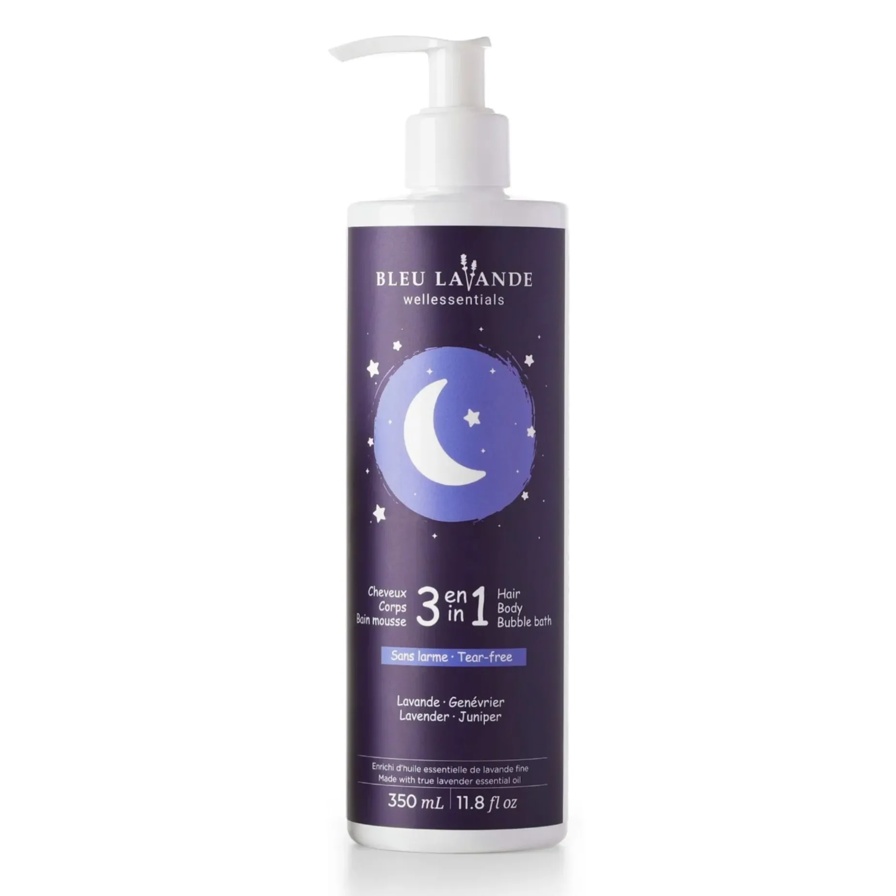 A convenient 3-in-1, tear-free, biodegradable, gentle, and soothing product that serves as a shower gel, bubble bath, and shampoo, transforming bedtime routines into calming moments with the true lavender and juniper essential oils.