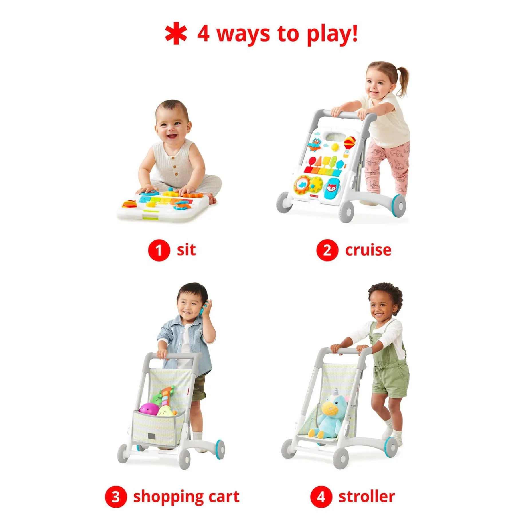 -4 ways to play: Sit,Cruise, Shopping Cart, Stroller