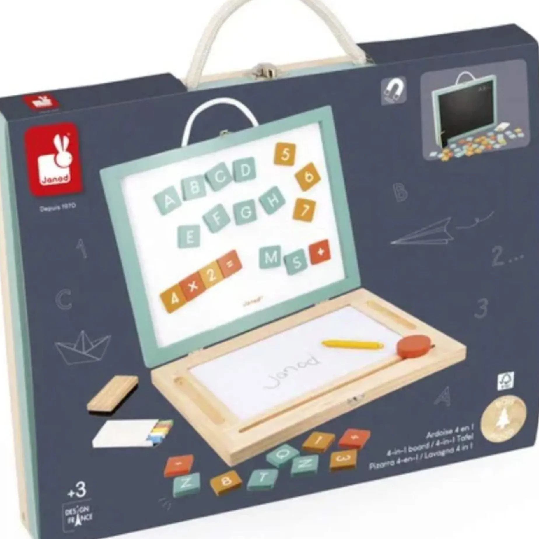 Invite your child to dive into a world of learning and creativity with the Janod 4-in-1 Portable Magnetic & Chalk Board, designed to stimulate young minds. This multifunctional slate, made of certified wood, easily transforms into a board, desk or desk, providing an ideal space for drawing, writing and playing.