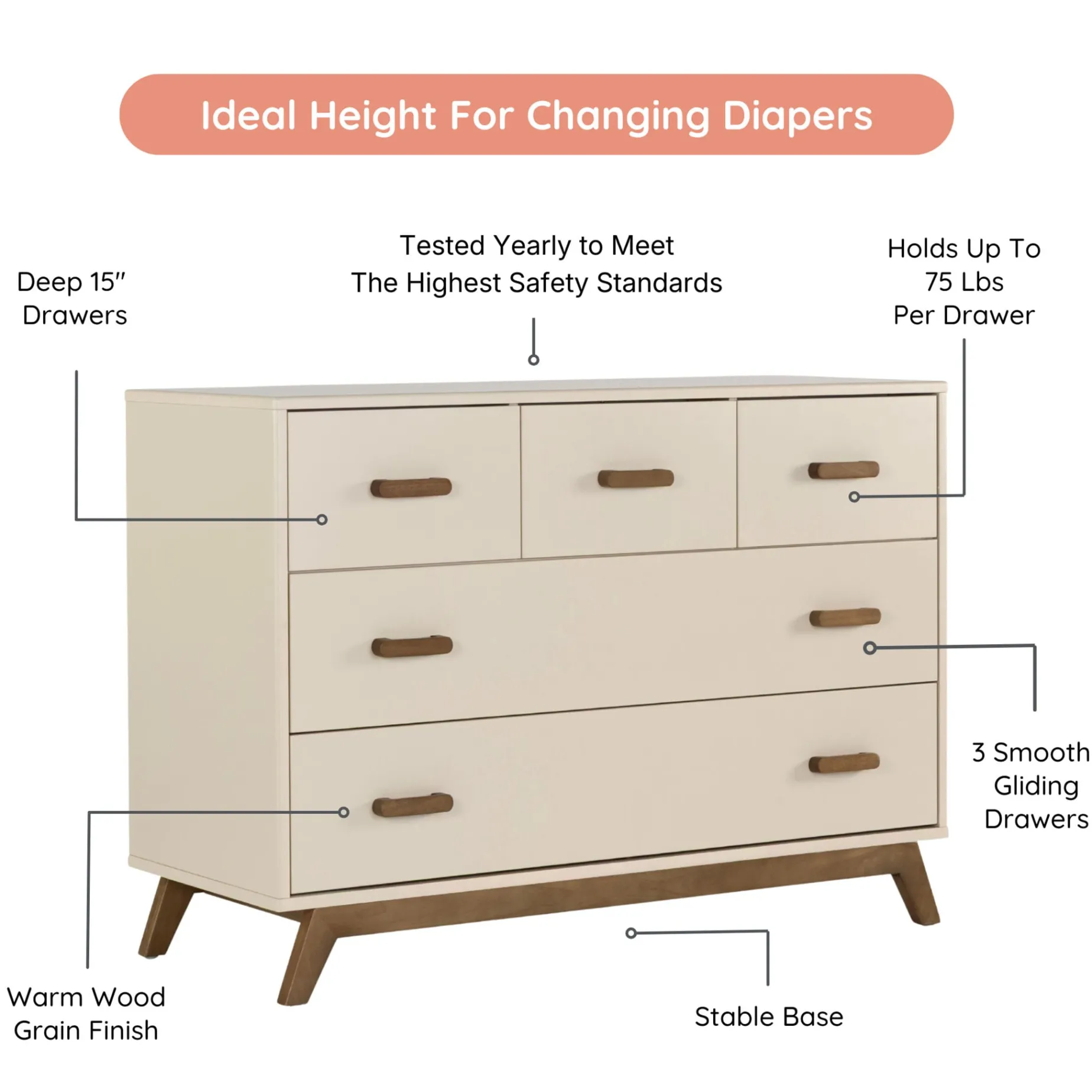 The 47” modern Soho 5-drawer Dresser’s classic style pairs perfectly with the Soho 3-in-1 Crib, or adds a pop of mid-century style to any room on its own. Safe, stable, and strong, with sturdy angled legs and solid wood handles, forged steel support, and a baby-safe painted finish. The removable changing tray (sold separately) fits snugly on top for the diaper years, and extra deep soft-close drawers provide ample storage as baby grows. Built to add beauty to your home for generations with seamless function and timeless style.