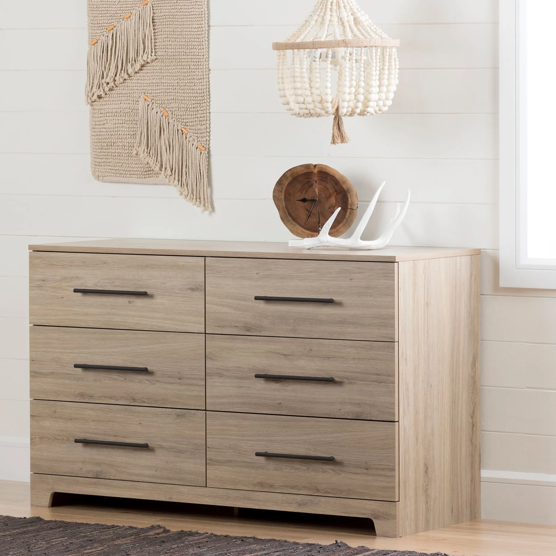 Contemporary Lines And Finish This Primo 6-drawer dresser has a timeless look and blends in easily with any decor. The contemporary lines are softened by the curved kick plate, and metal handles add character and value to the furniture. The neutral, modern style makes it suitable for men’s, women’s or kids bedrooms, providing plenty of storage space in this attractive piece of furniture.