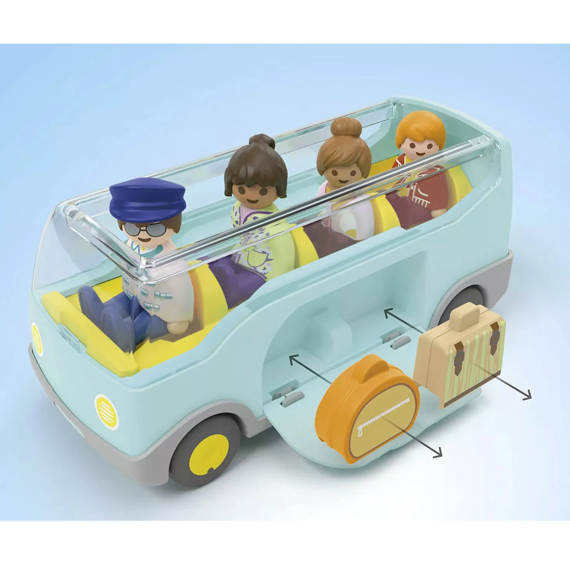 All aboard for adventures with the 1.2.3 PLAYMOBIL travel bus! Includes four characters and a travel bus. Suitcases fit into the compartments of the bus, adding a fun shape-sorting element to playtime.