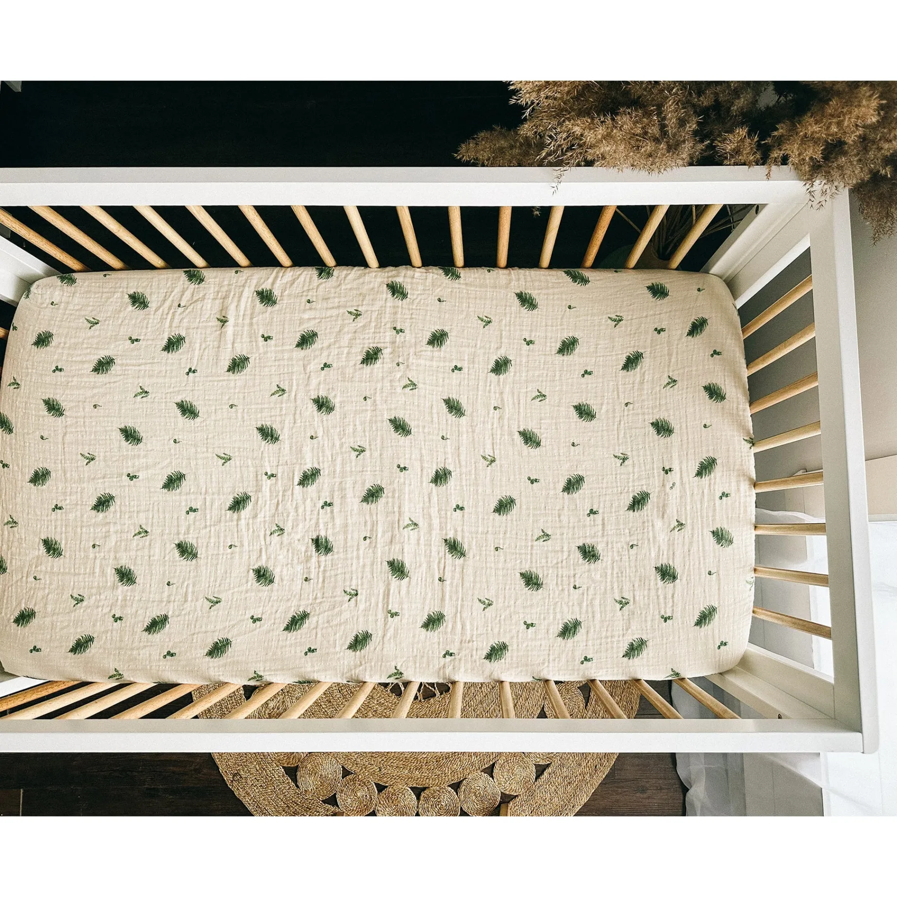 Made from premium organic cotton muslin, this fitted sheet is designed for crib mattresses and features a wide elastic band to fit different mattress thicknesses and stay securely in place.