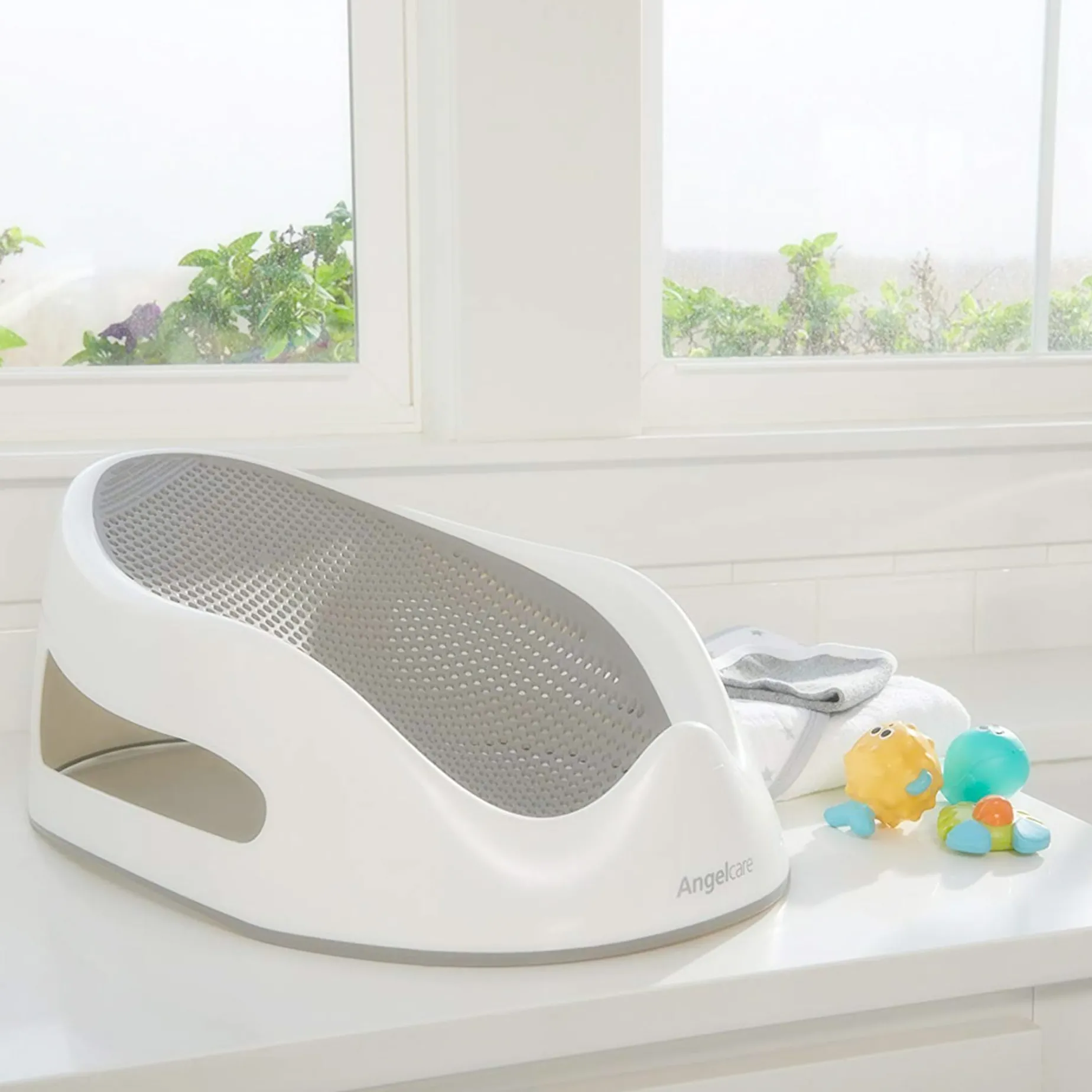 The Grey Bath Support’s unique design combines safe, sturdy sides and an angled area made from special soft material for your baby.