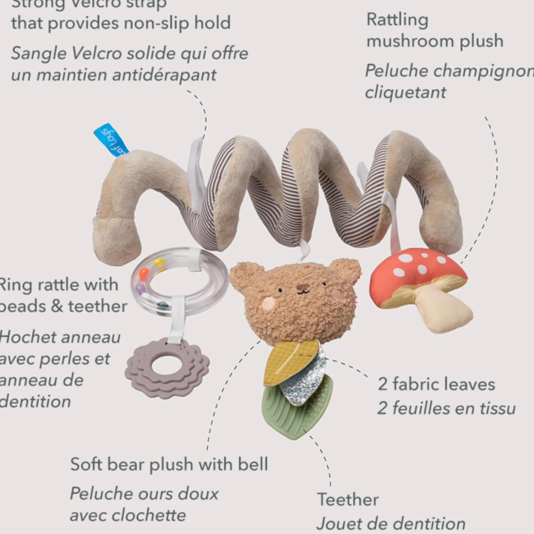 Designed for parents on the go, the Bear Hug Spiral features a soft bear plush, a mushroom plush, colorful teethers, and beaded rings – all attached to a spiral for stroller, pram, or car seat entertainment. This engaging spiral helps keep babies happy and occupied during outings!