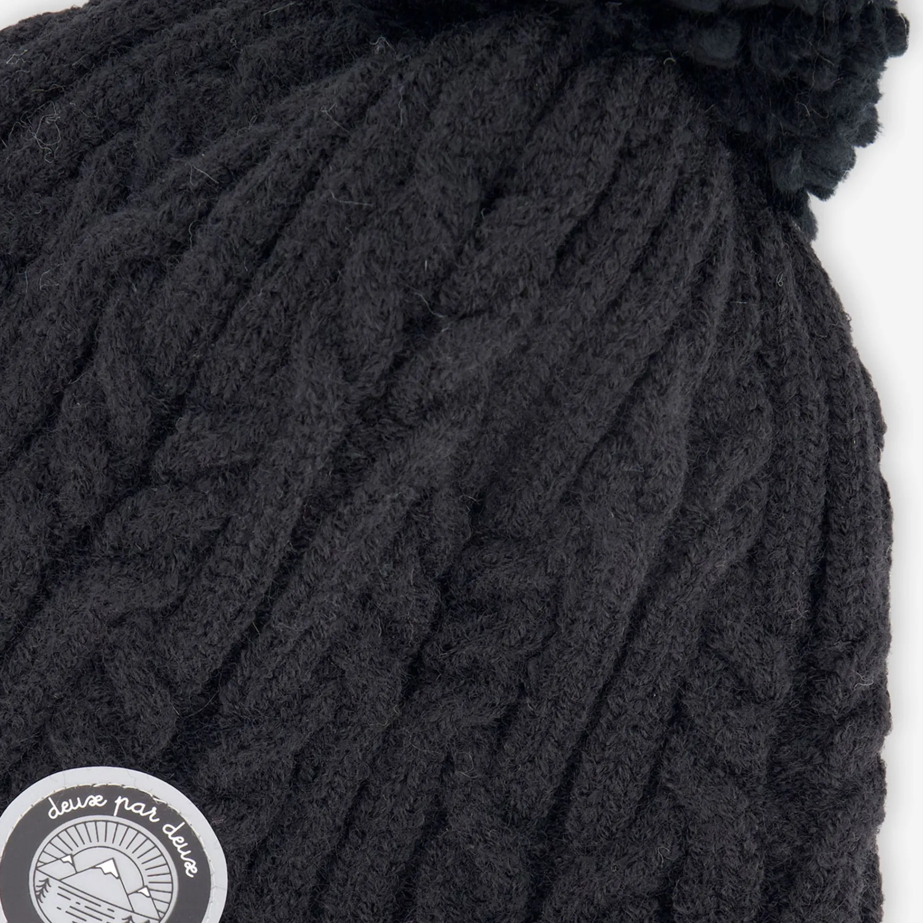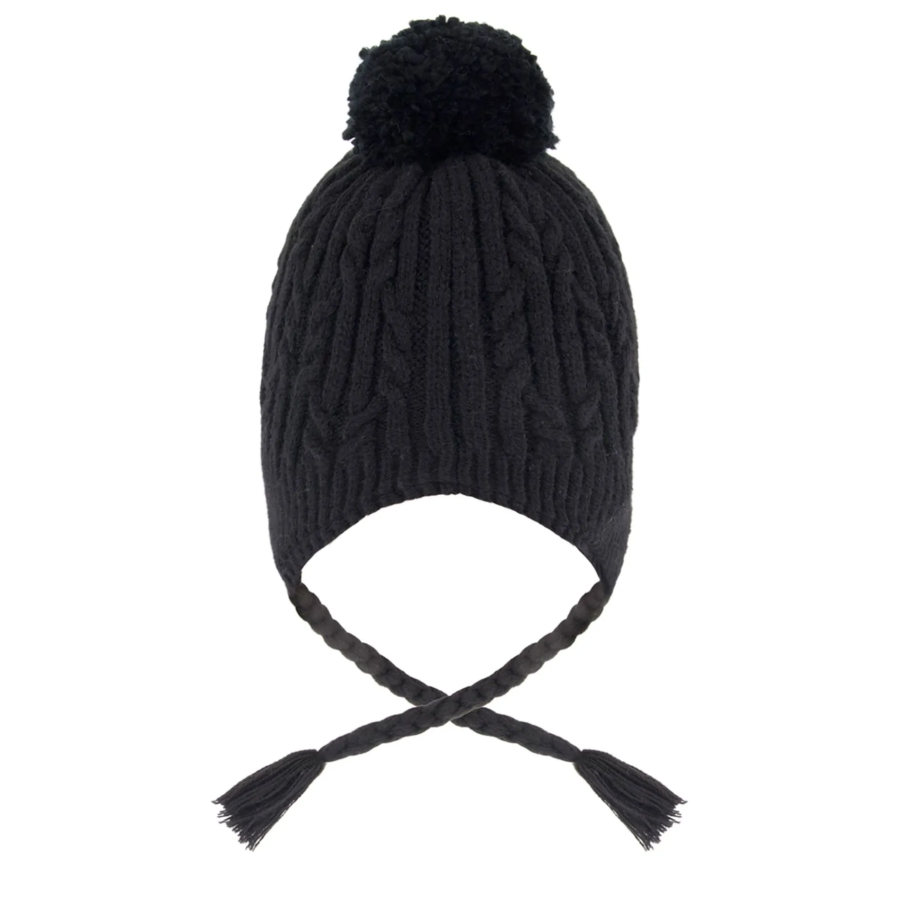 Lined with polar fleece for added warmth, this knit cap in off-white is winter weather-approved. In a Peruvian silhouette with extended side panels that cover and protect the ears, this winter hat features a chunky cable knit texture, braided side tassels, a fluffy pompom, and a logo patch for brand distinction.