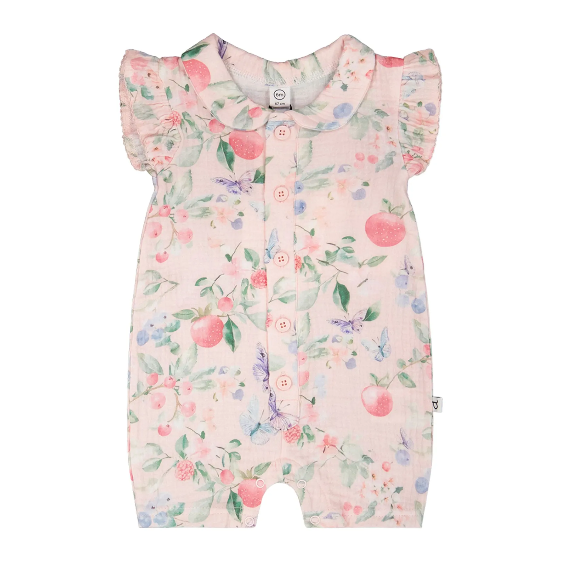 Sweet berries and fluttering butterflies bring a touch of magic to the cotton muslin romper pink with printed berries. This sleeveless item features frilled shoulders, a small flat collar, a button placket down the front, and snap closures at the legs for easy changes. Made from lightweight cotton muslin, the fabric is soft, breathable, and perfect for sunny summer adventures. A cheerful piece from our “Blueberry Cuddles” collection that combines everyday comfort with playful charm.
