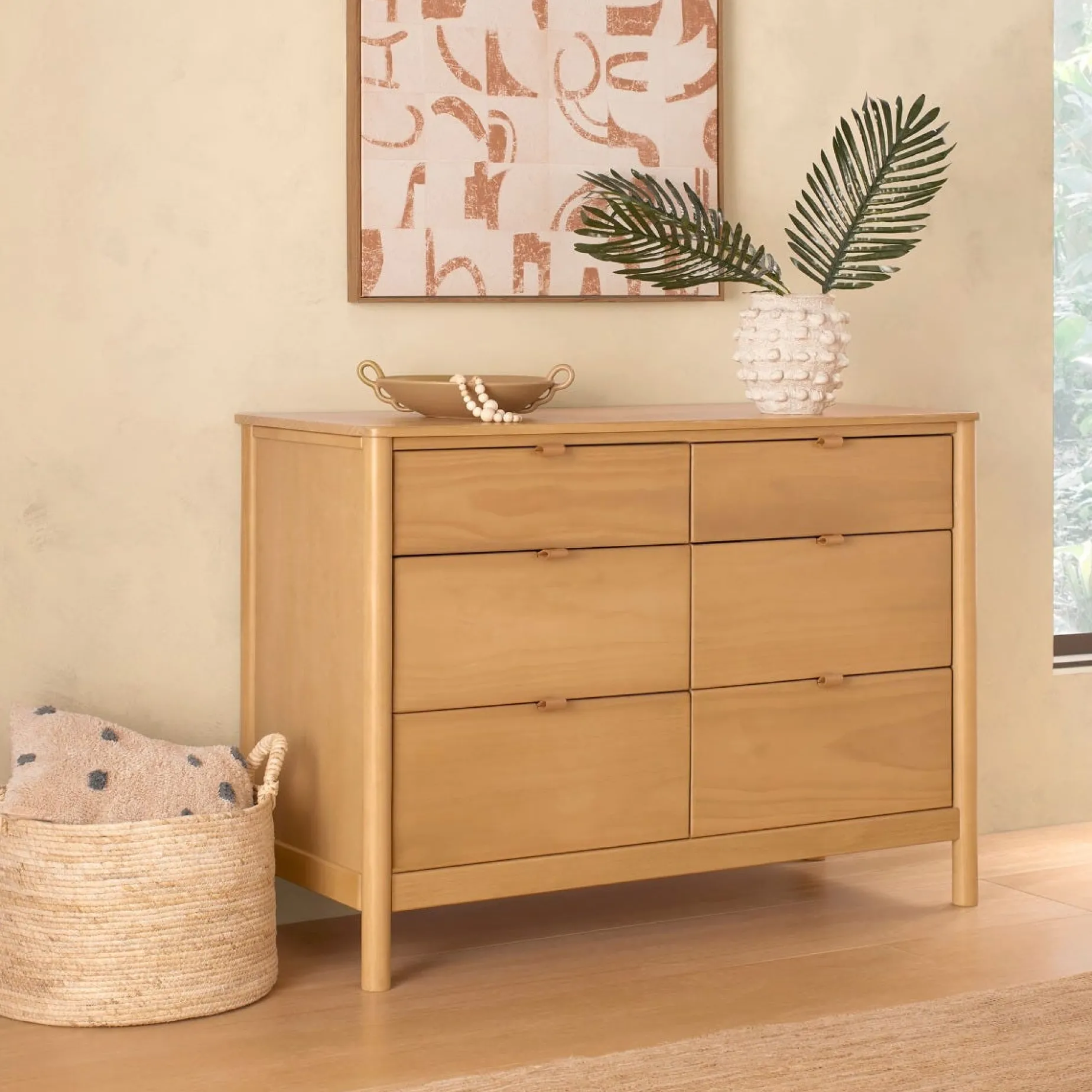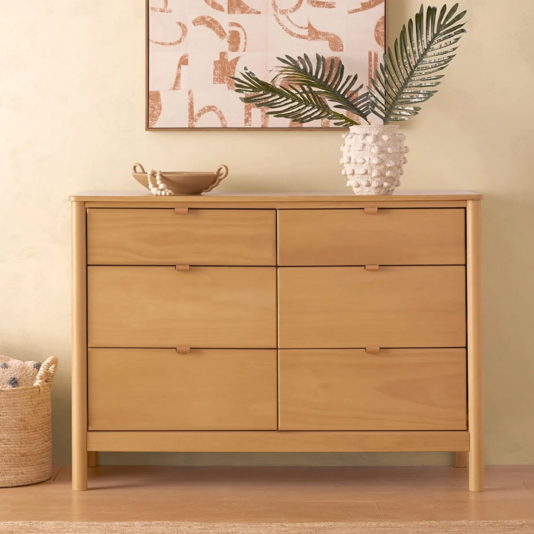The simple yet sophisticated Bondi 6-Drawer Assembled Dresser complements both the Babyletto Bondi Cane 3-in-1 Crib and the Bondi Boucle 4-in-1 Crib with its warm wood finish and tonal vegan leather drawer pulls, rounded posts and minimalist silhouette. It’s designed for the nursery with spacious smooth-glide drawers, included anti-tip kit for safety, and best-of-all it arrives fully assembled, ready out of the box.