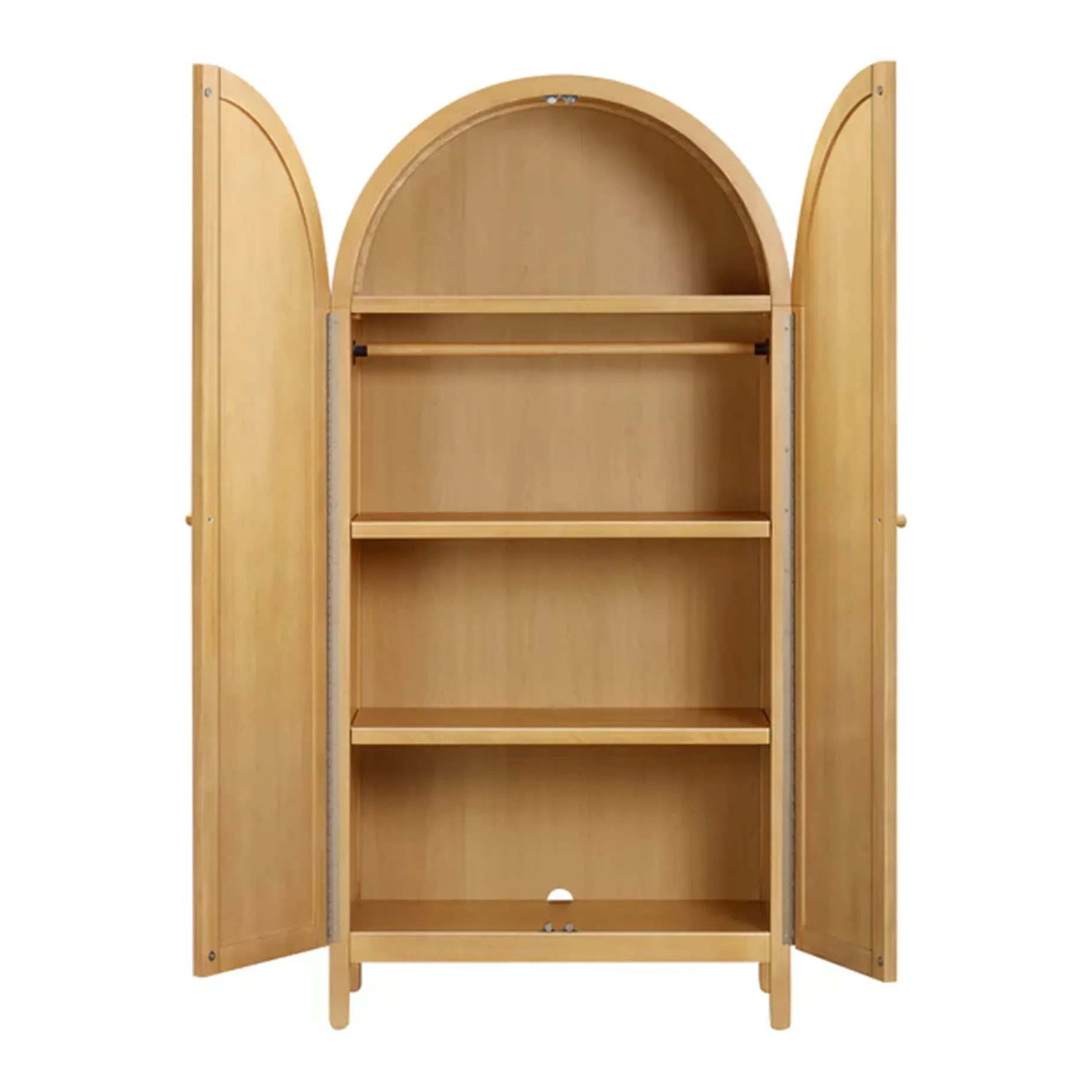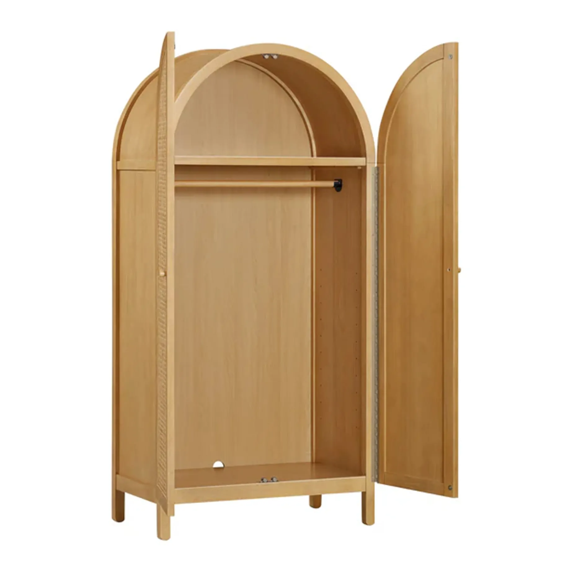 Thoughtfully crafted and fully assembled, the Bondi Cane Armoire blends effortless style with practical function—perfect for your nursery and your home. Magnetic-close double doors create a sleek, secure shut, while natural cane panels add an organic touch to any room. Inside, a pre-installed clothing rod is ideal for hanging little outfits, and four spacious shelves provide ample storage for essentials, blankets, and toys—offering versatility from the early years and beyond.