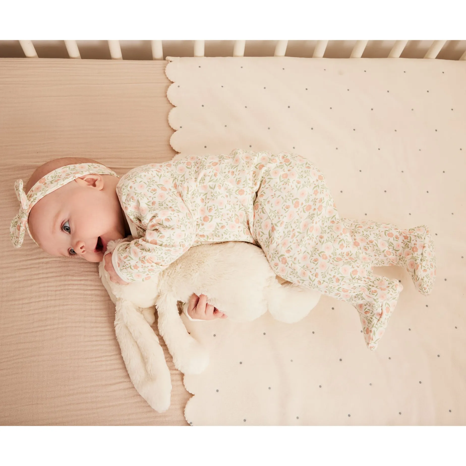 This infinitely soft floral sleeper is made from organic interlock cotton, for a light and comfortable fit. To take care of delicate skin, anti-scratch mittens are integrated into the sleeves of birth and 3 month sizes.
