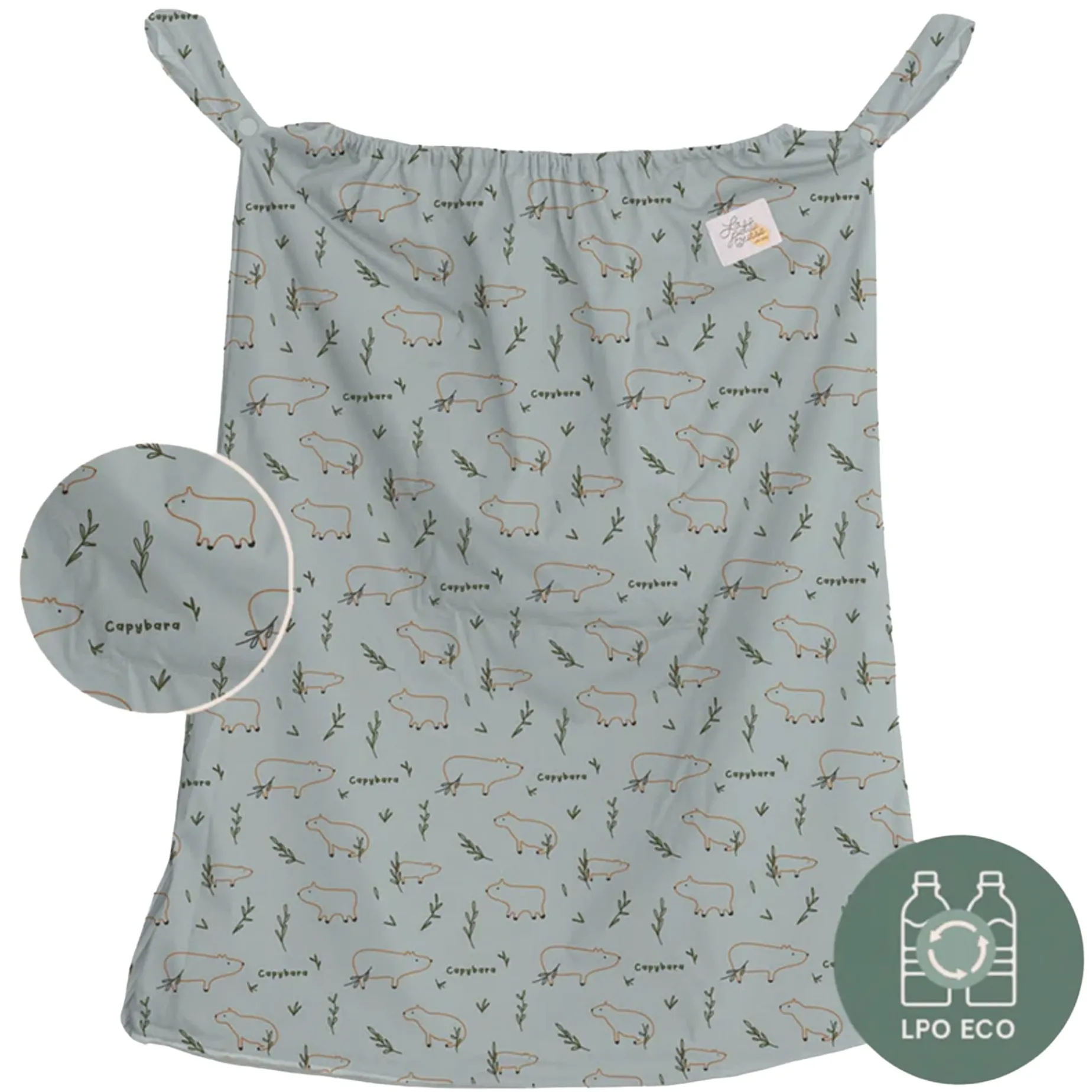 A durable bag made of waterproof recycled polyester for disposing of your used diapers after use. Each bag can hold approximately 20 diapers. The bag has an elastic band that can be placed in a dirty diaper pail or hung using its two straps.