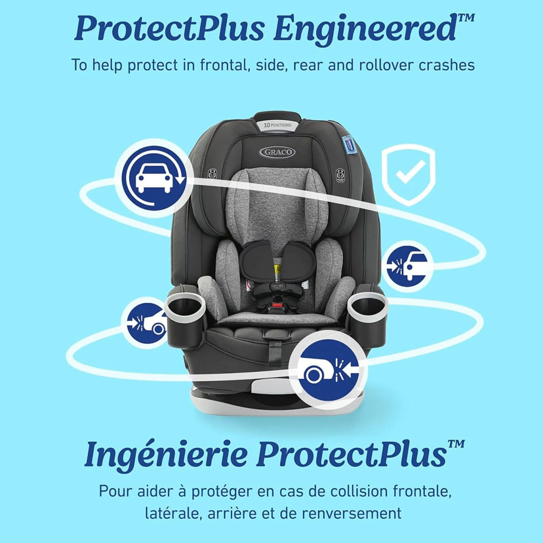 – 10-position headrest supports your child’s head through every stage of growth