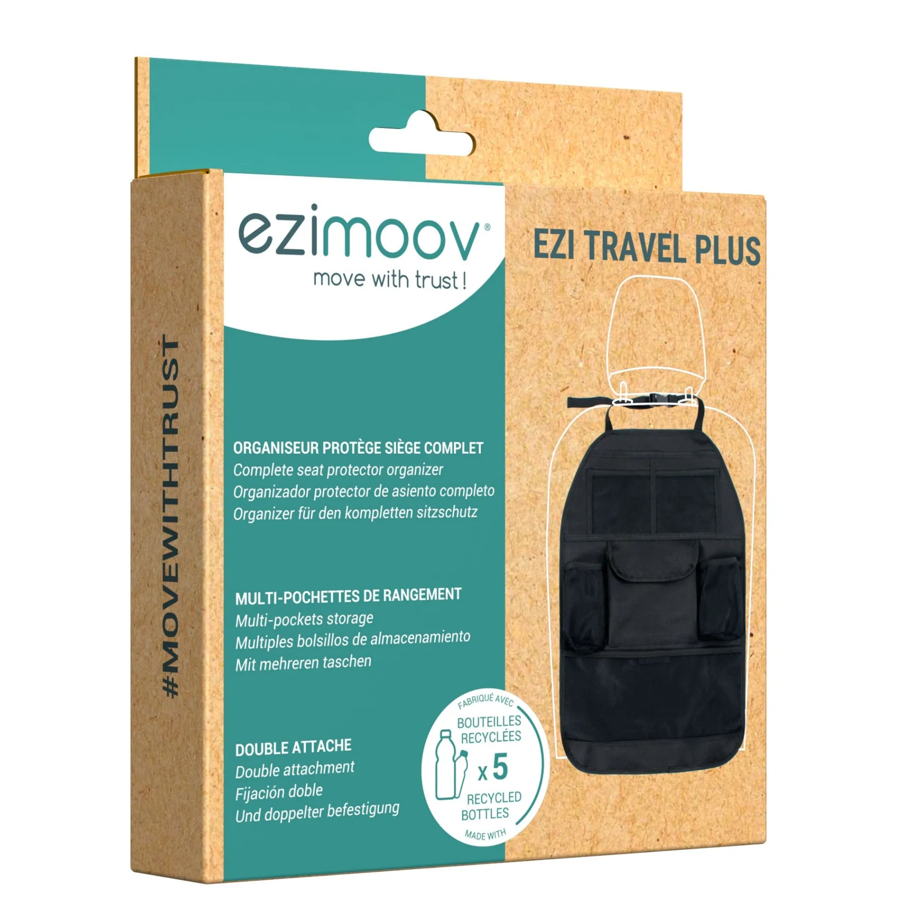The EZI TRAVEL PLUS is made from 92% recycled plastic. The seat organizer is designed to last over time and withstand any test.