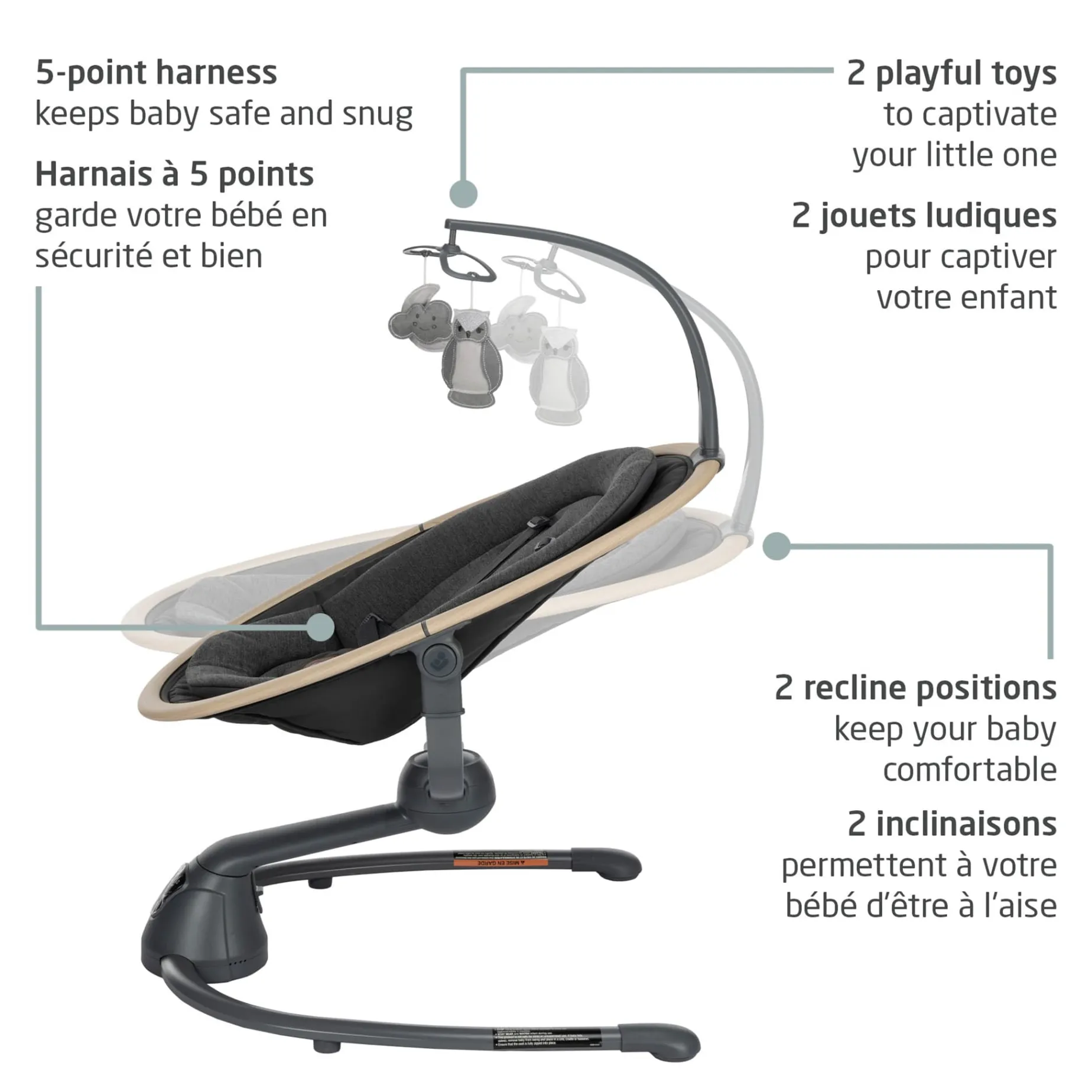Its luxurious finishing and high-quality fabrics ensure the design matches any interior, and it comes with an easy to remove and machine-washable cover. Finally, Cassia comes with two toys to give your baby something to look at, two recline positions and a soft and cozy newborn inlay to provide you and your baby with the utmost comfort.