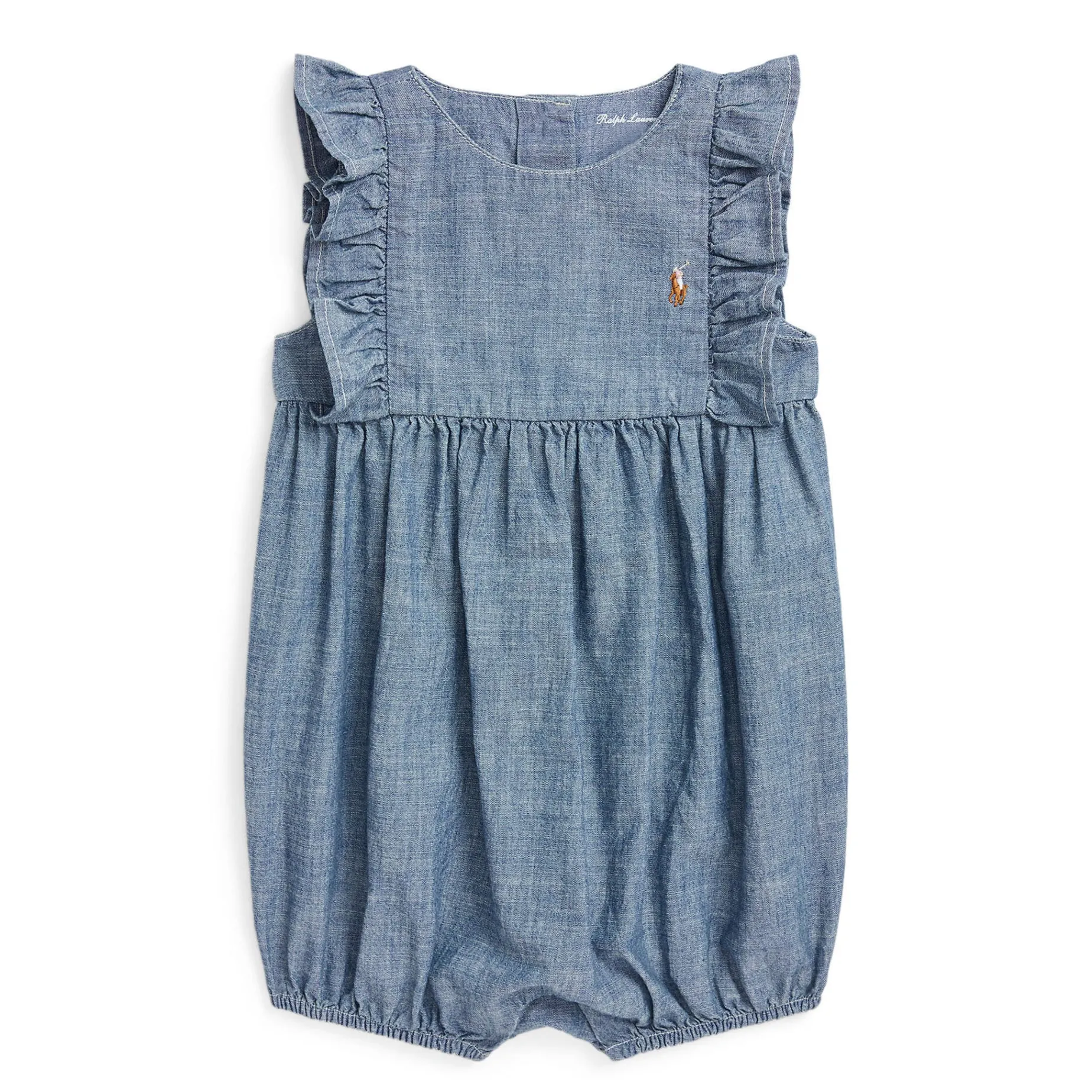 Made with indigo-dyed cotton, this one-piece is extra cute thanks to ruffle trim and our multicolored embroidered Pony.