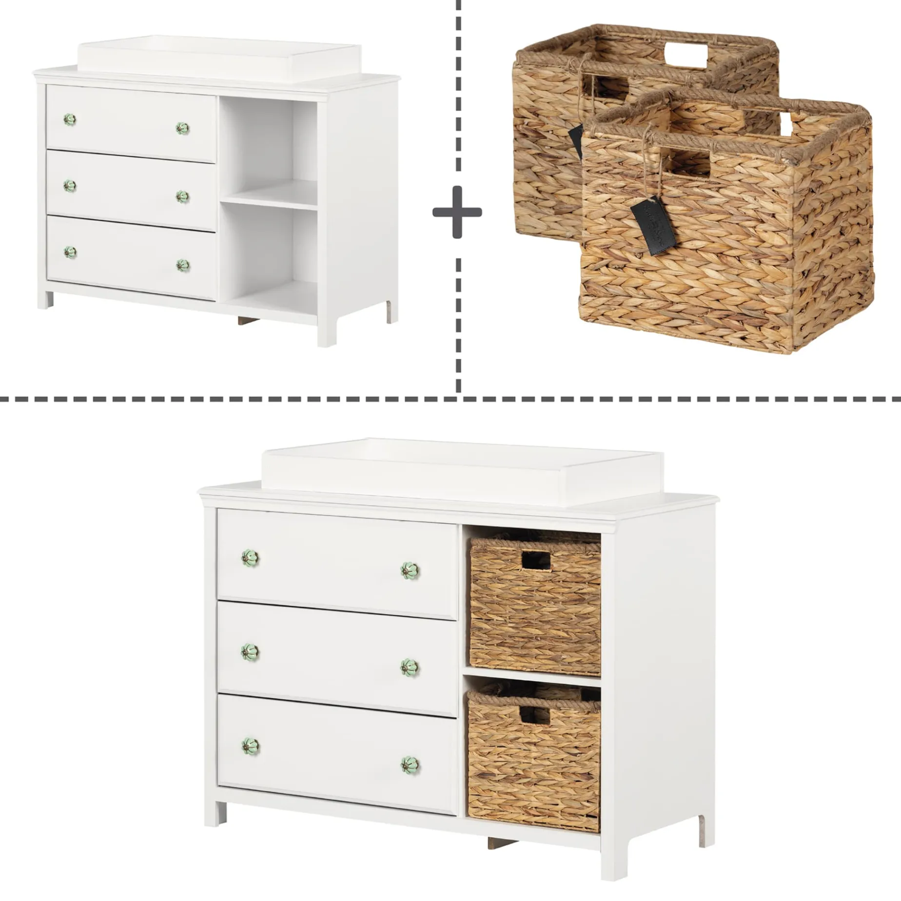 BOHEMIAN STYLE: The wicker baskets and colored handles on this piece call the hot trend of today – bohemian – directly to mind! This changing table will give your little one’s room a somewhat simple, eclectic look.