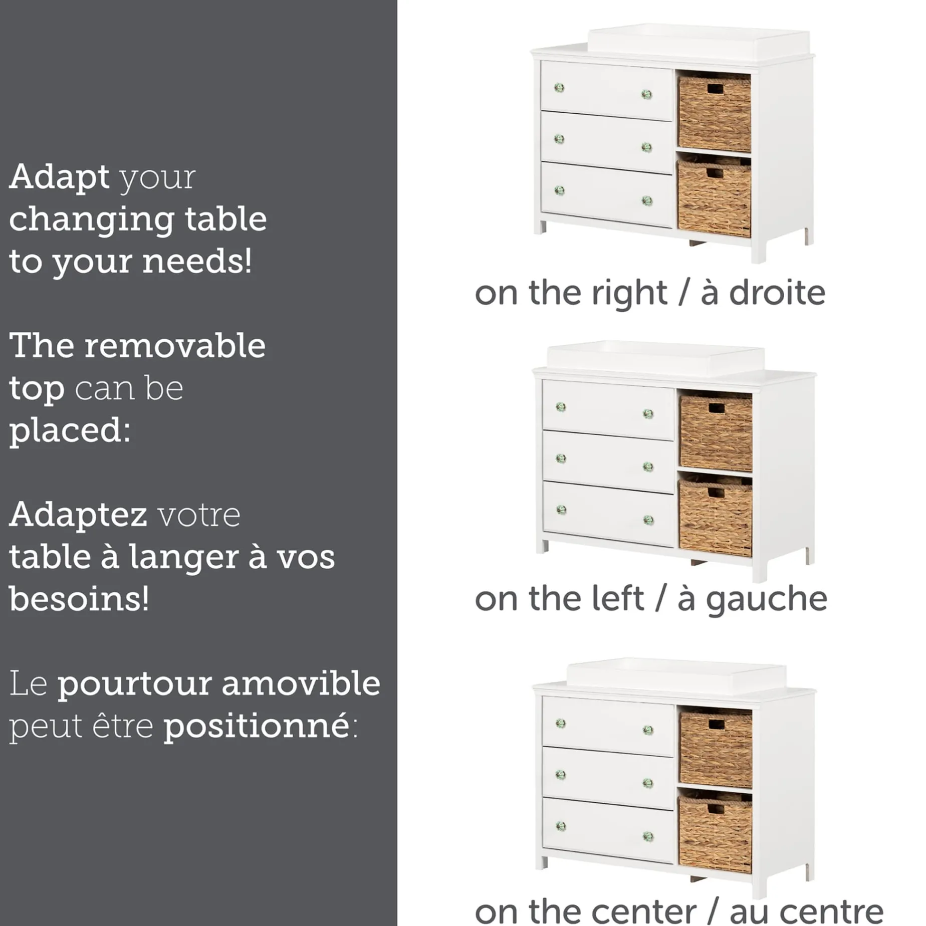 Safety is a priority No need to worry – your little sweetie will be safe, since this changing table has a rim on the top surface. So the mat will stay in place when you’re changing baby. We’ve also added a space by the rim for powders, creams, and wipes. So you can just reach over for them, without taking your eyes off baby. This piece has also been tested according to ASTM standards, which apply to furniture in North America. Now that’s real peace of mind!