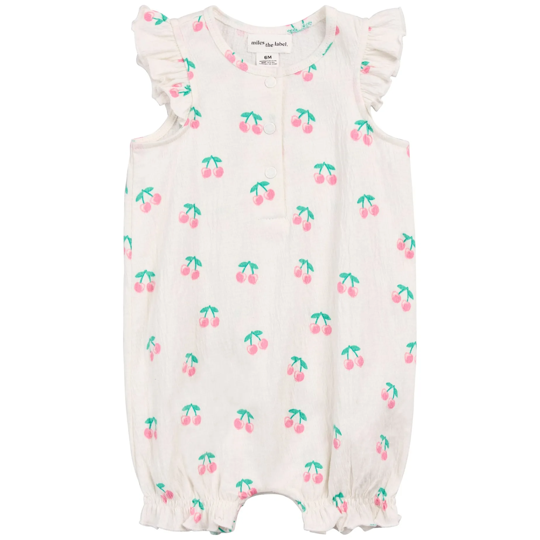 Sweet as cherry pie, this flutter-sleeved romper has an all over Cherry print and frilly finish on the legs. Made with organically grown cotton crinkle jersey, the romper is ultra soft and breathable for the warmer days. Snap buttons along the legs and a button placket on the front provides ample ways to make dressing and changes a total breeze.Â