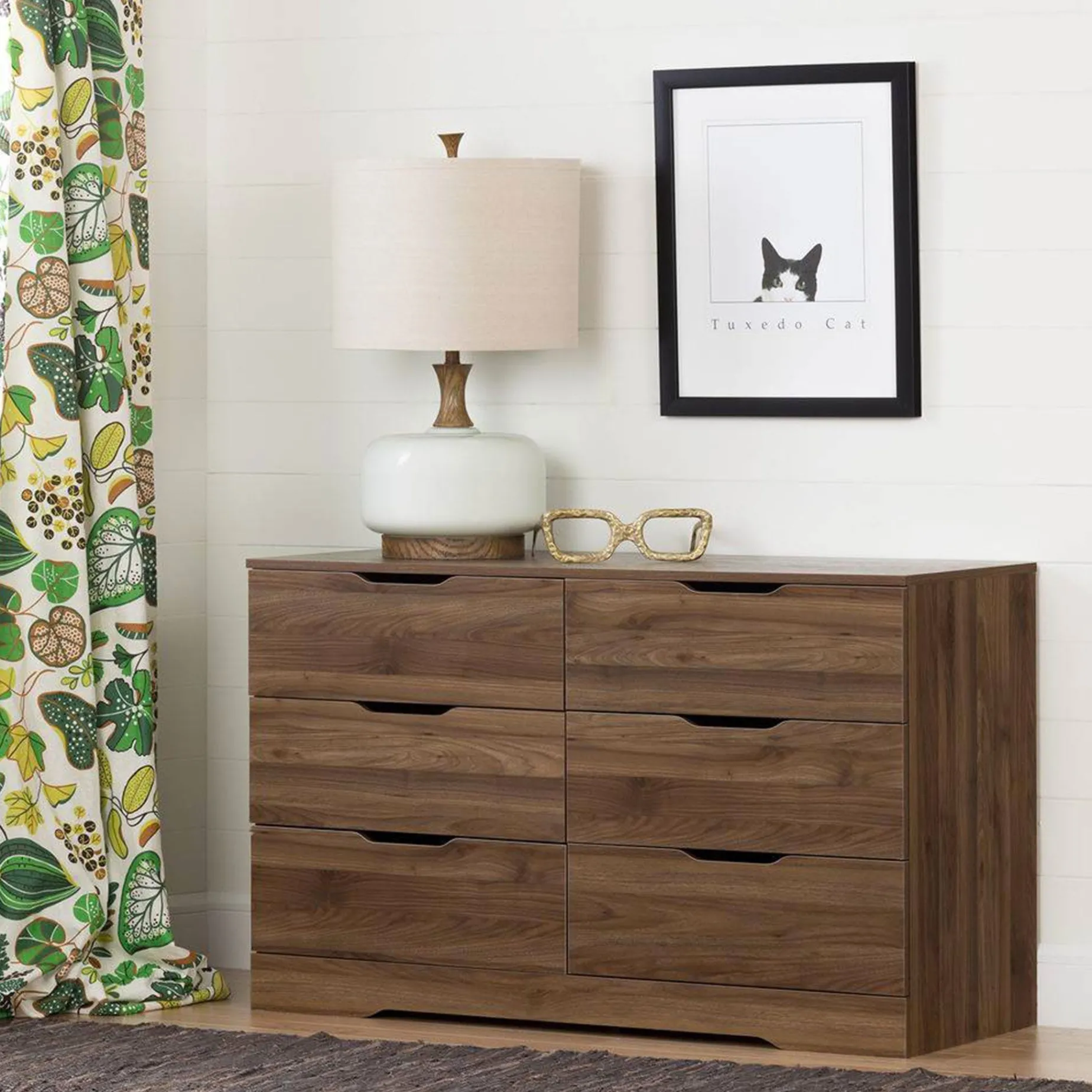 This Holland Collection 6-drawer dresser has a timeless look and blends in easily with any decor. The contemporary lines are softened by the curved kick plate, and cut-out handles add character and value to the furniture. The neutral, modern style makes it suitable for men’s, women’s or kids bedrooms, providing plenty of storage space in this attractive piece of furniture.