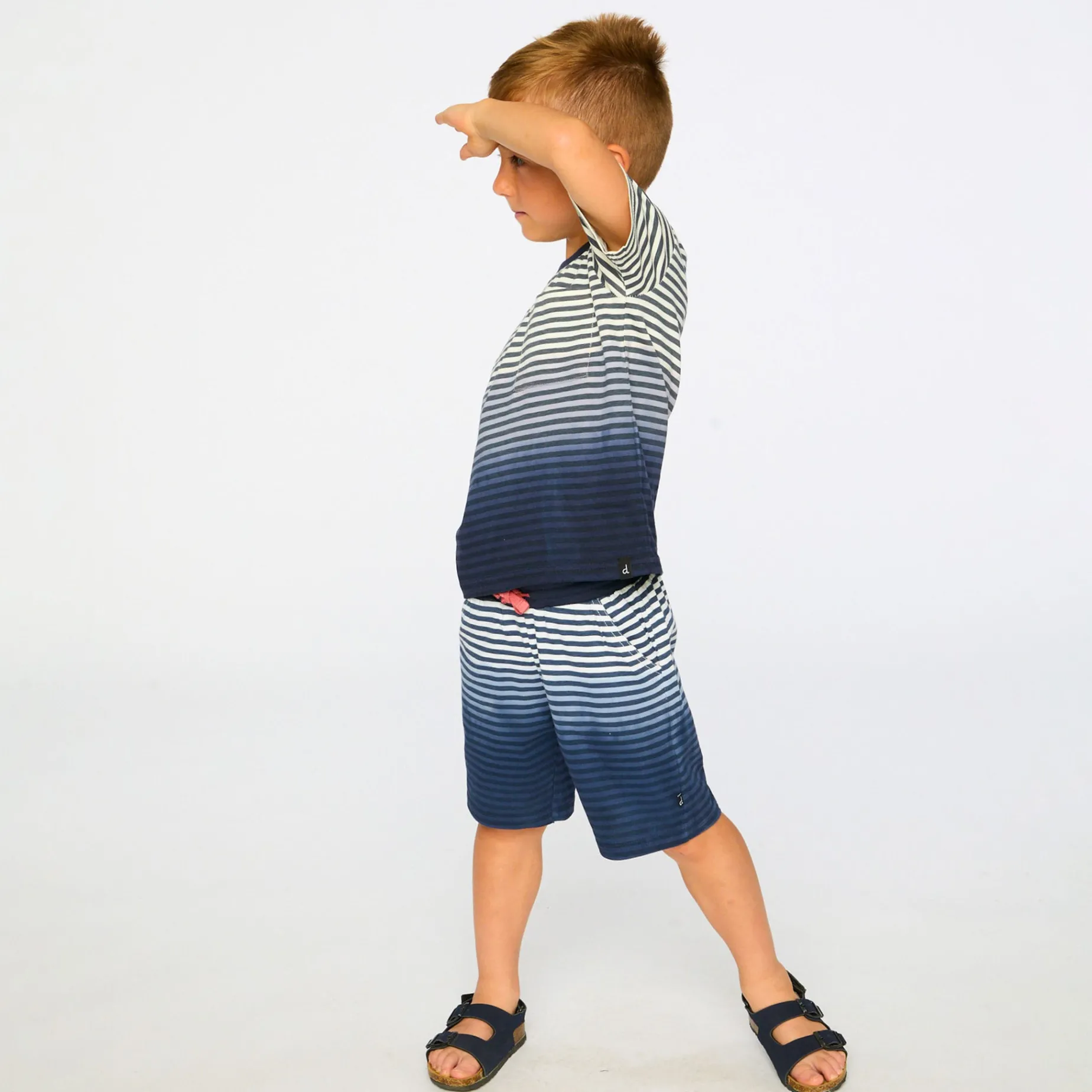 The organic cotton short sleeve t-shirt in blue gradient stripes is a playful essential for sunny days. This tee features a round neckline, a small patch pocket on the chest, short sleeves, and a lively striped gradient in shades of blue that makes it stand out. Made from breathable organic cotton, it’s a perfect match for any bottom in the “Coastal Days” collection.