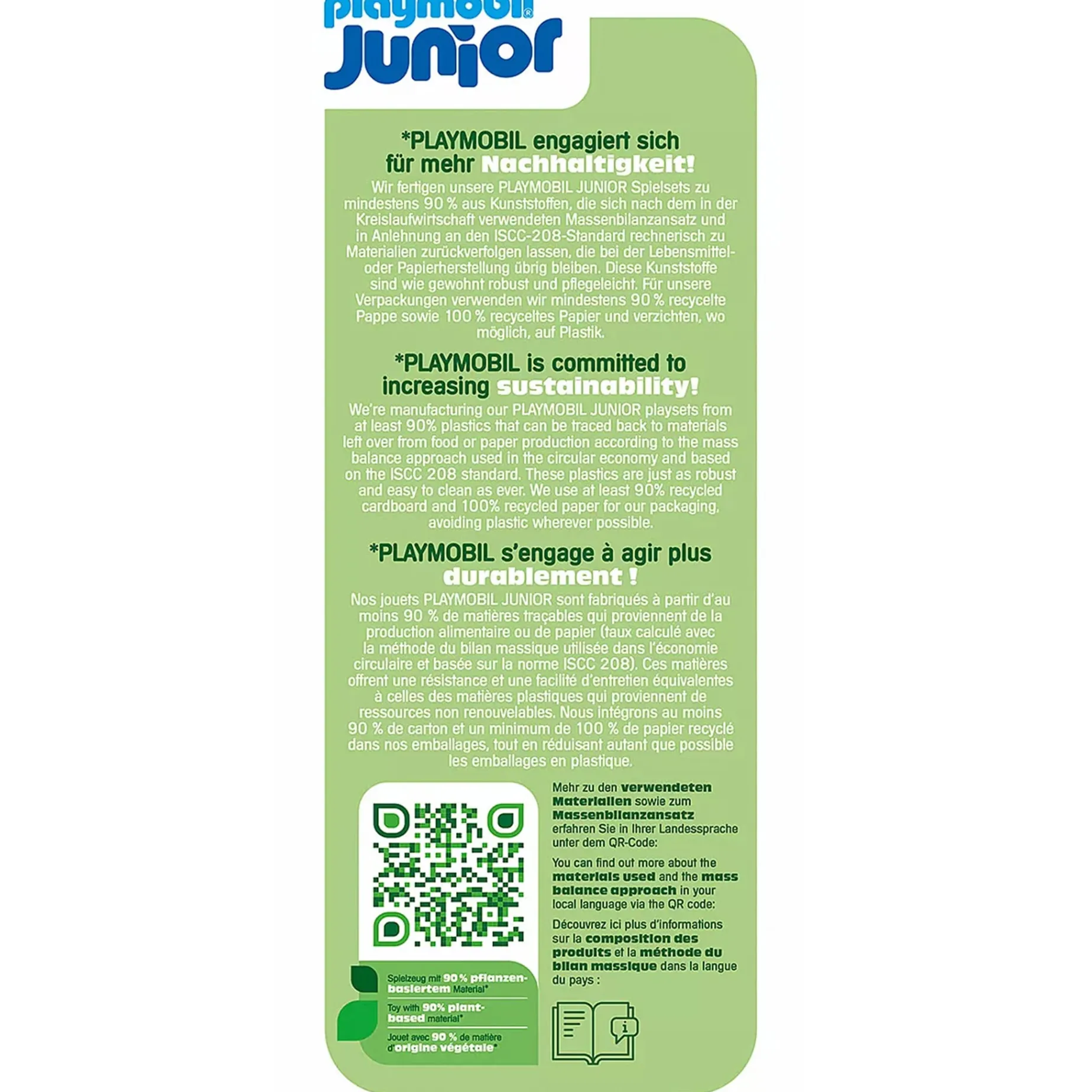 All PLAYMOBIL JUNIOR playsets are also made from more than 90% plant-based plastics, which can be traced to materials from food or paper production, using the mass balance approach in the circular economy. These plastics are as robust and easy to maintain as usual.