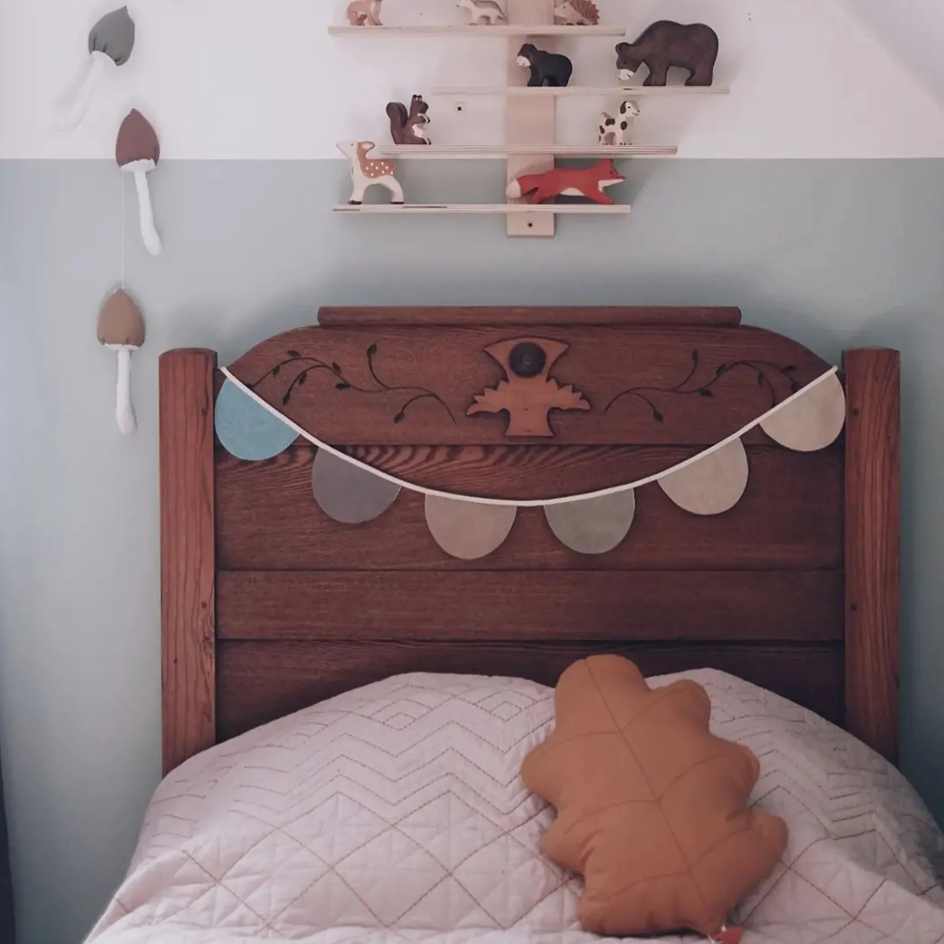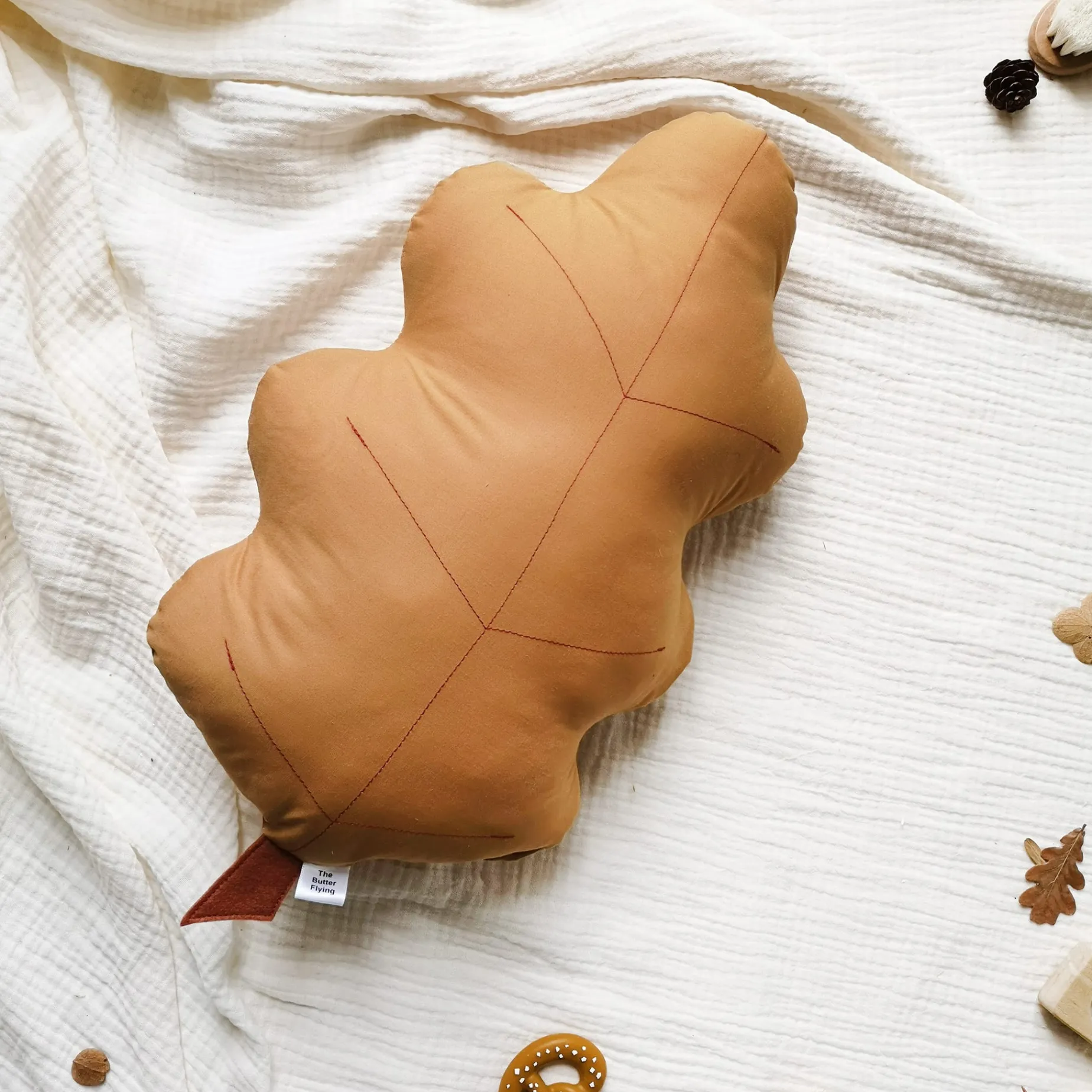 Decorative cushion in the shape of oak, leaves inspired by the forest for a nature-themed baby room decoration.