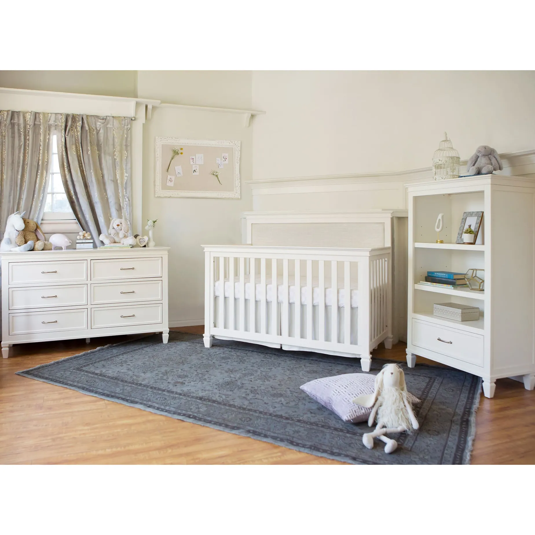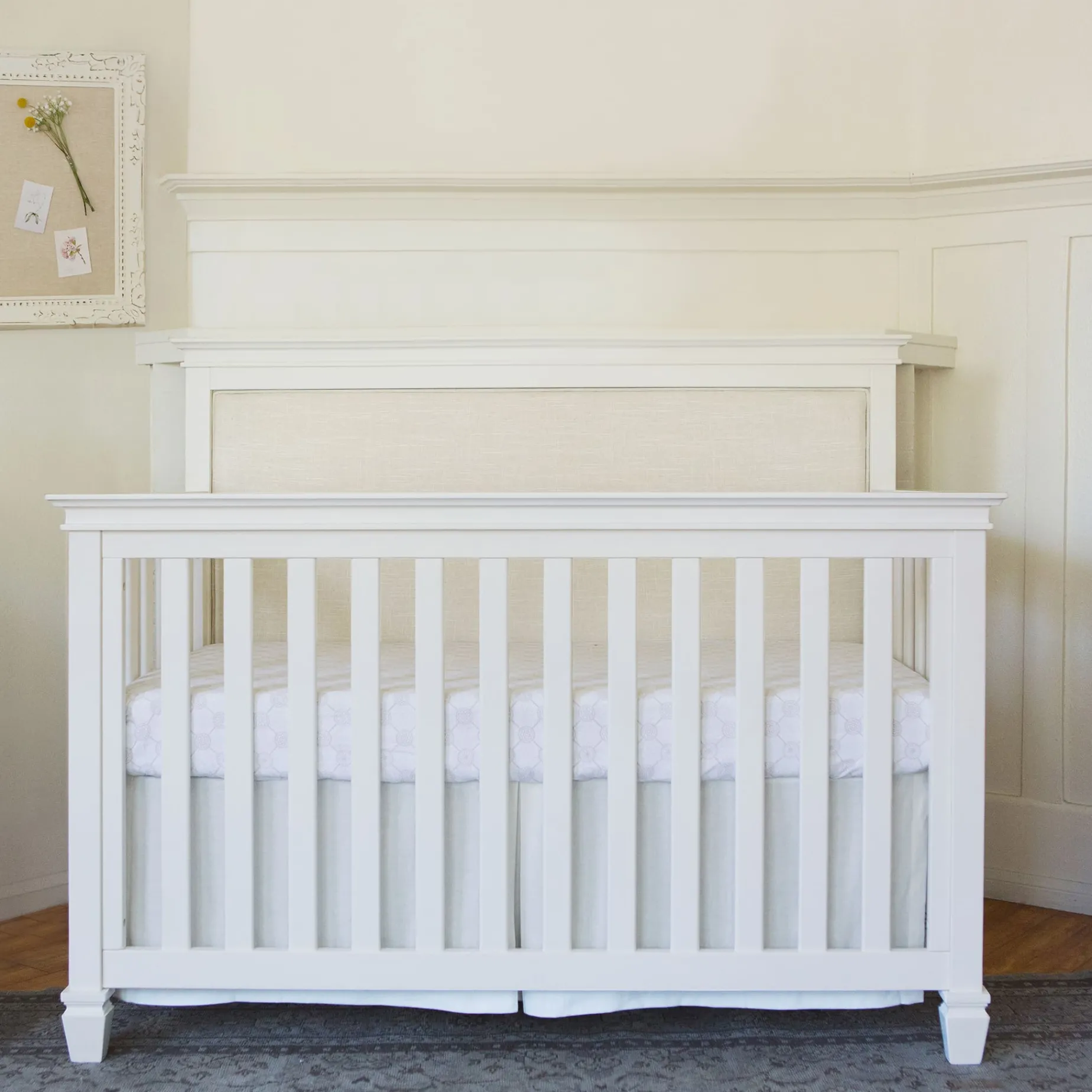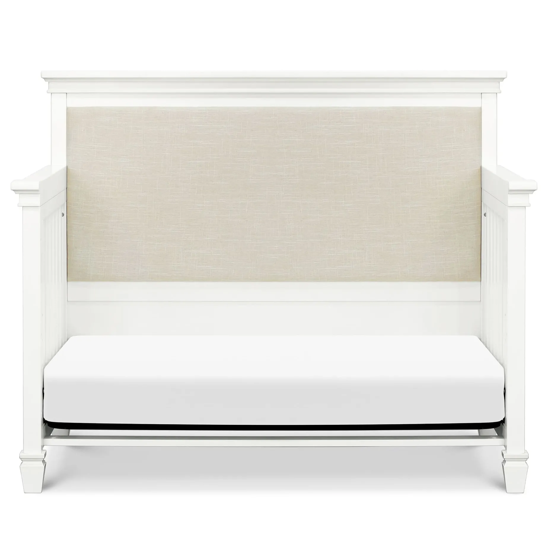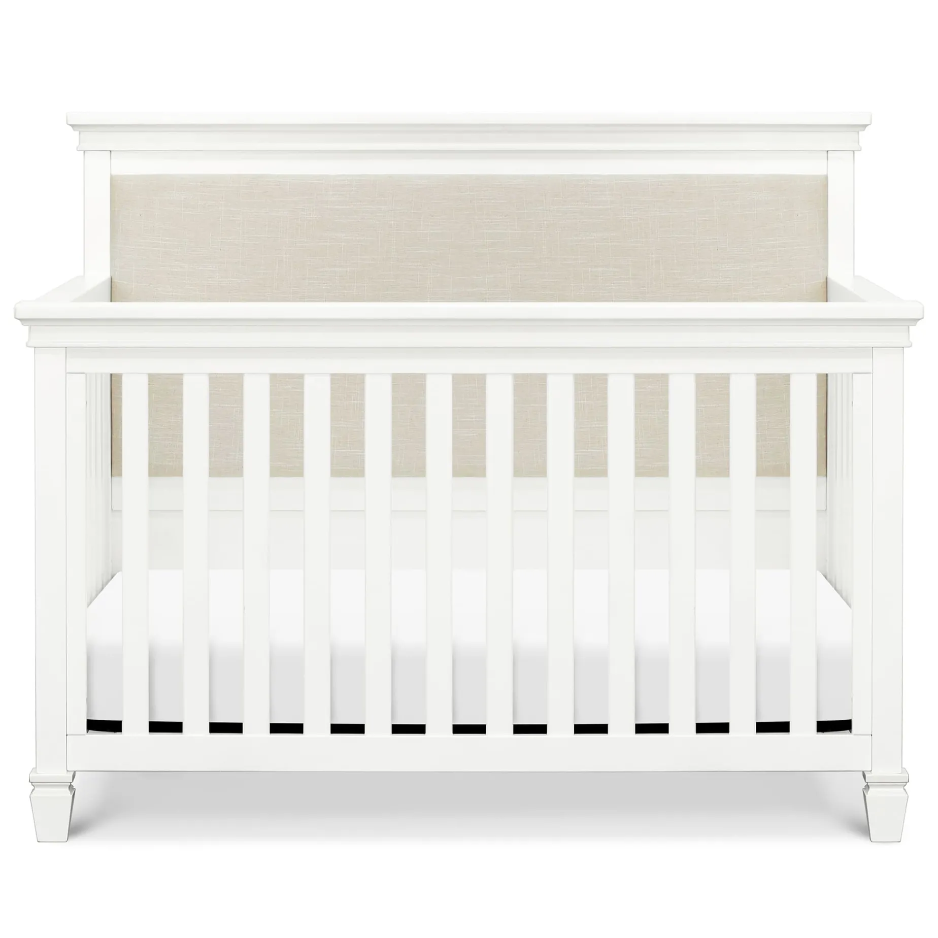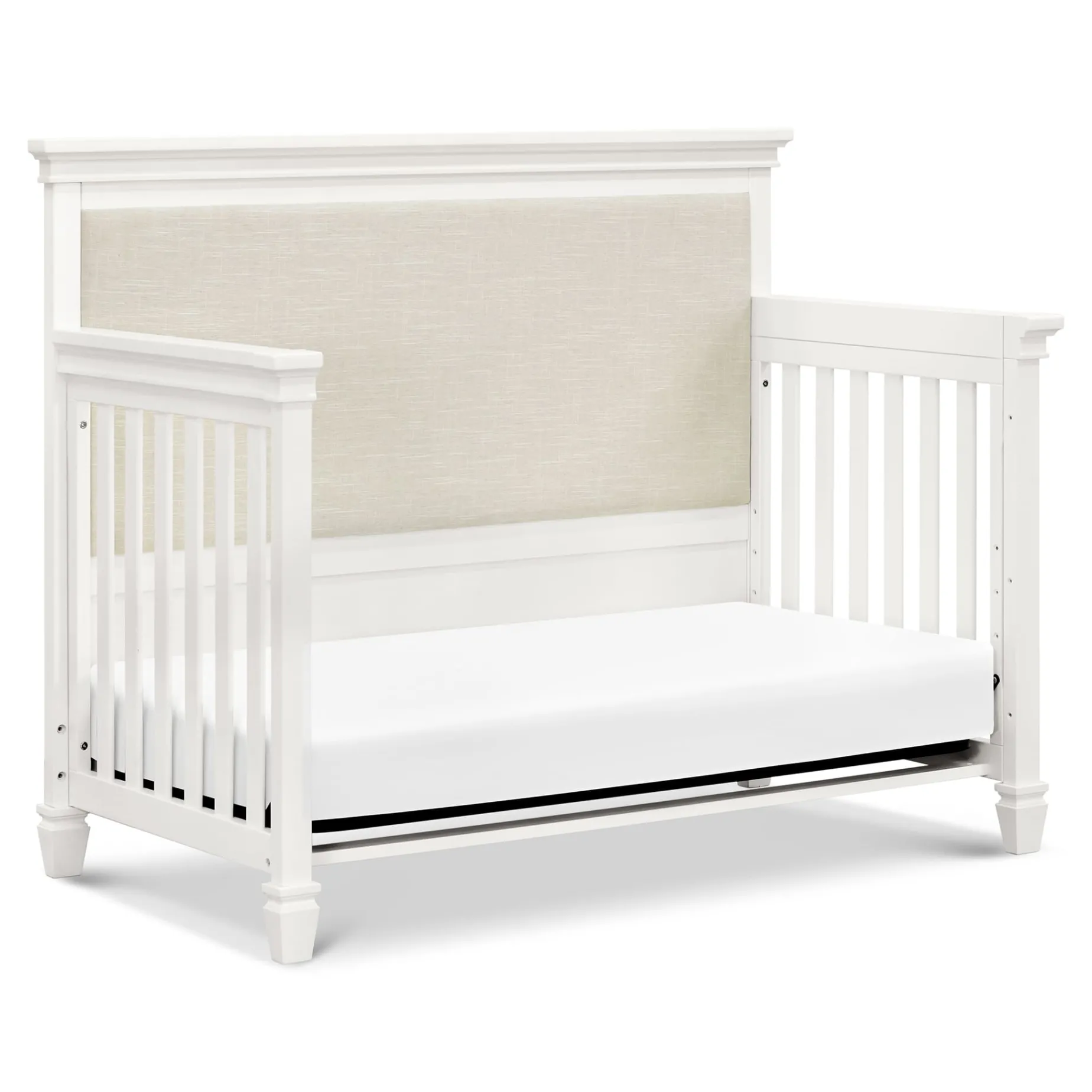 The Darlington 4-in-1 Crib brings the sophistication of relaxed French country style into the nursery. The Darlington balances delicate lines, gently detail molded tapered feet, and a lush upholstered back panel. Crib converts to a toddler bed, daybed, and full-size bed.