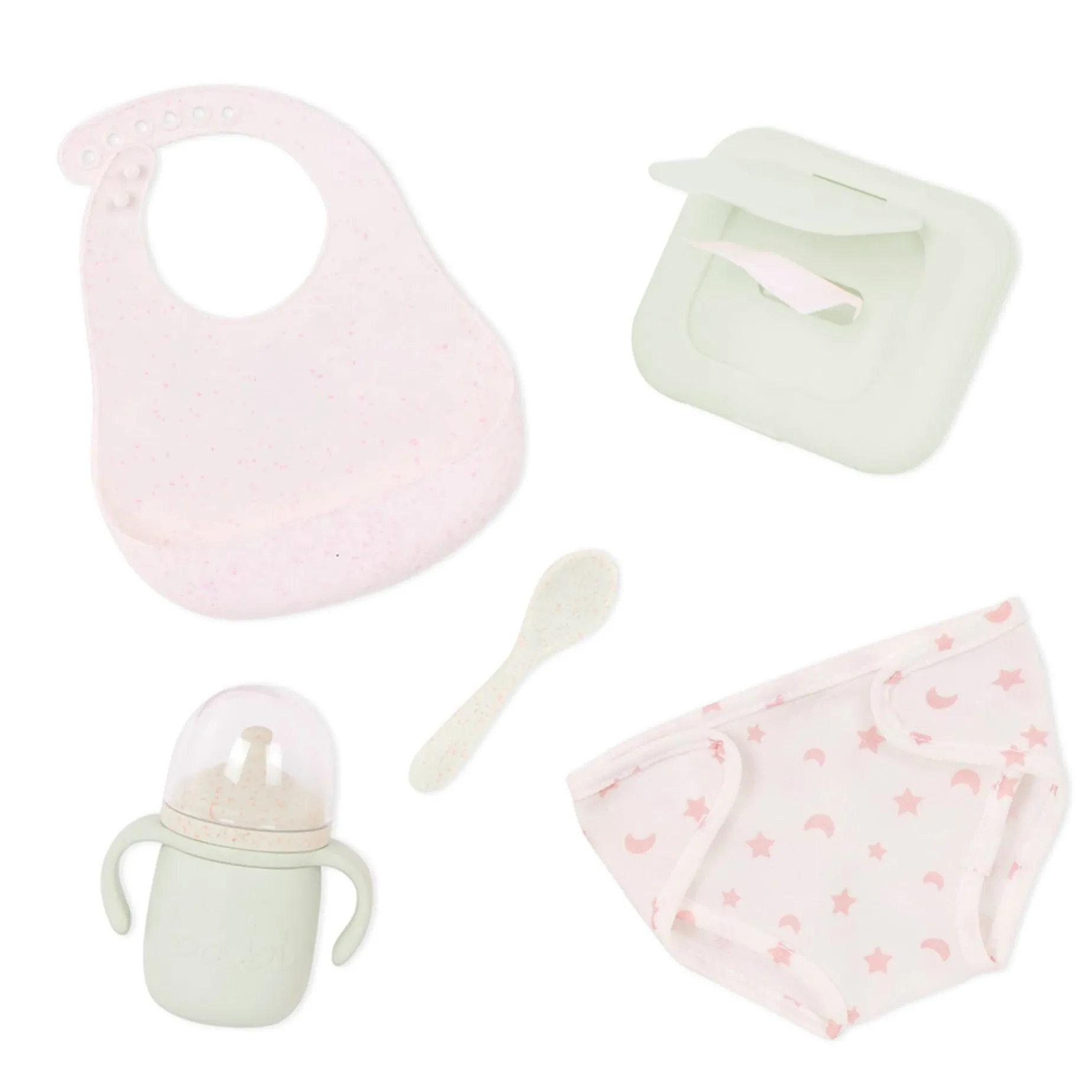 Includes: 1 bib, 1 bottle with lid, 1 spoon, 1 diaper and a pack of wipes