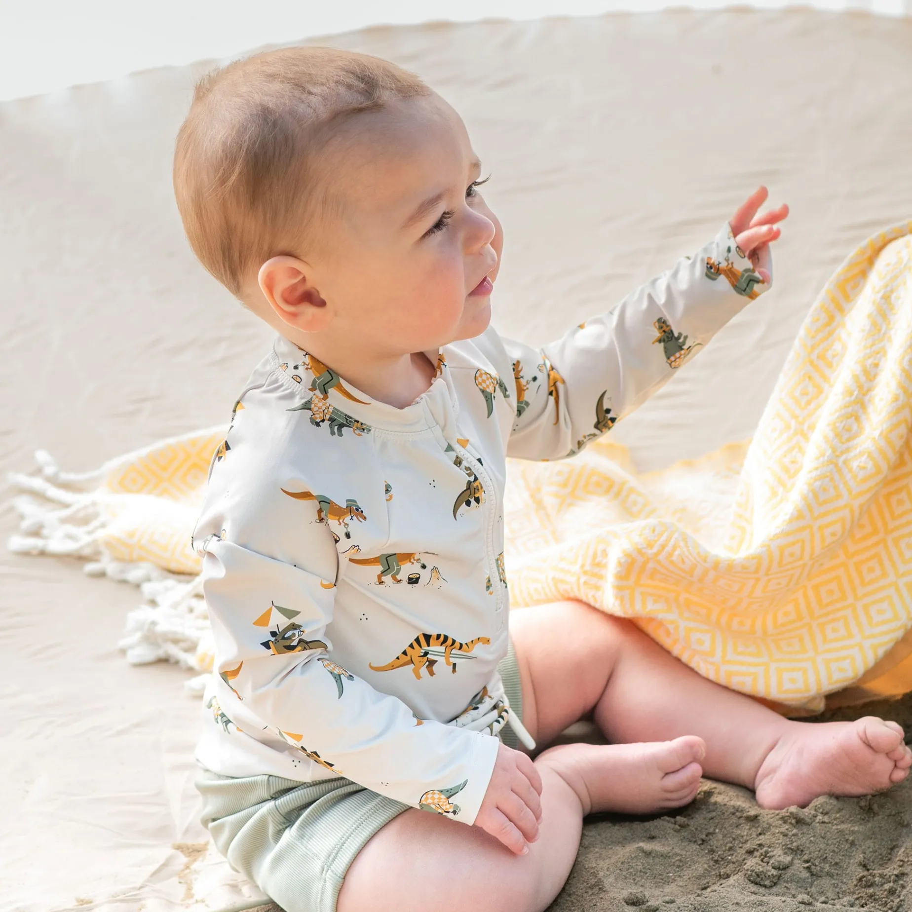 Roar into summer fun with your little guy in this dinosaur print rash guard set. Perfect for little explorers, he’ll have the best day when you combine sun safety and his favourite print. The two-piece set is designed with easy-dressing features – such as the half-zip drawstring waistband – and built with quick-drying fabric and UPF50+ sun protection. He’ll enjoy all day comfort and confidence while navigating salty waters, chilly pools or hot sands.
