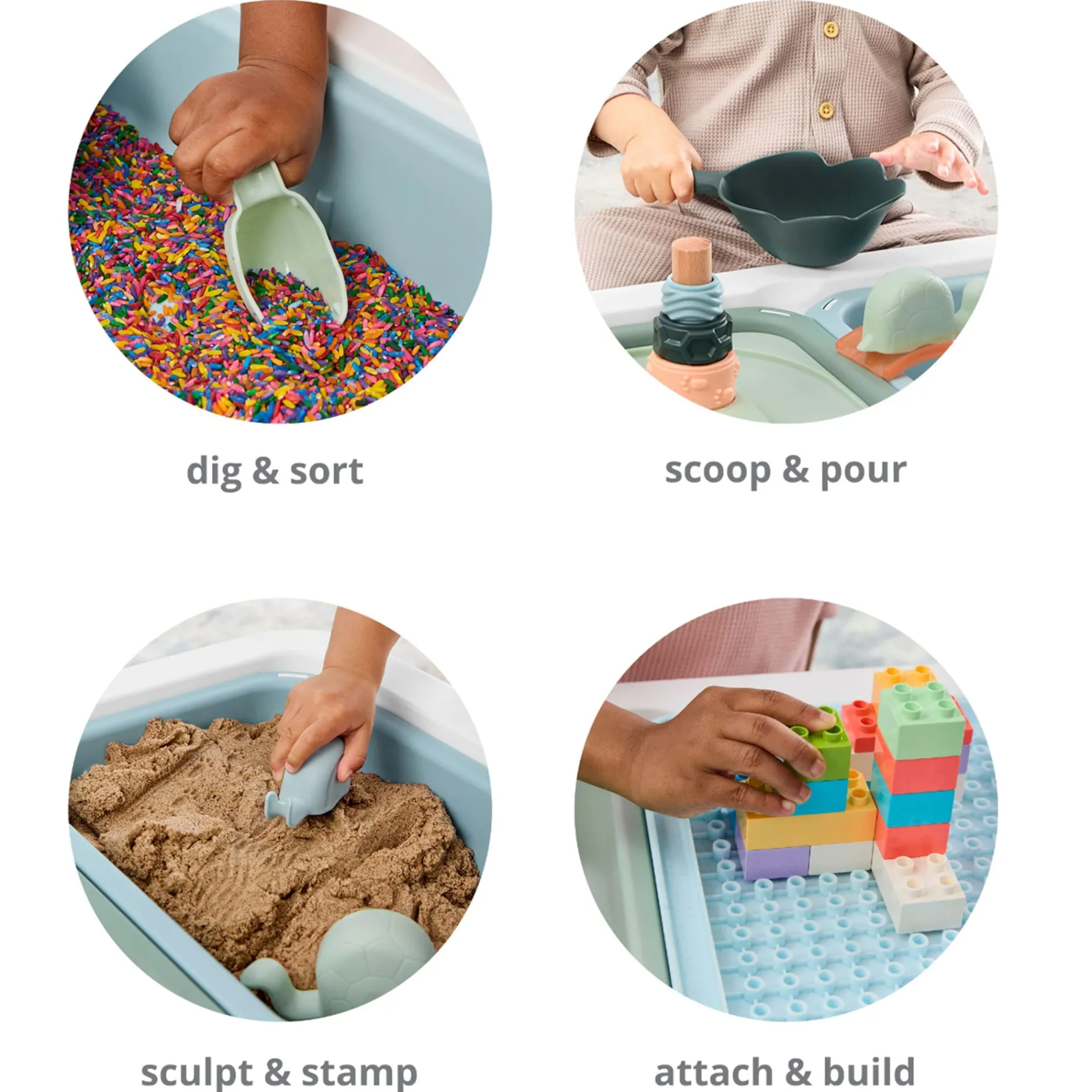 Developed in collaboration with a sensory play expert, our 24-piece sensory table for toddlers set offers limitless ways to explore, learn, create and play. Designed to grow with your child, early sensory exploration begins with floor play and the included tools (wooden tongs & rollers, animal scoops, shovel rake & more)—they can be used in so many ways! As your little one grows, add the legs to the sensory table and experiment with fillers such as sand, dry pasta, water, sculpting clay and more found objects. Dig, sort, sculpt, scoop, pour & more—stretch your imagination and create a hands-on landscape for sensory play for toddlers. Need inspiration? The included activity guide has lots of sensory play ideas to try using our sensory bin table and your own sensory fillers for years of learning & fun.