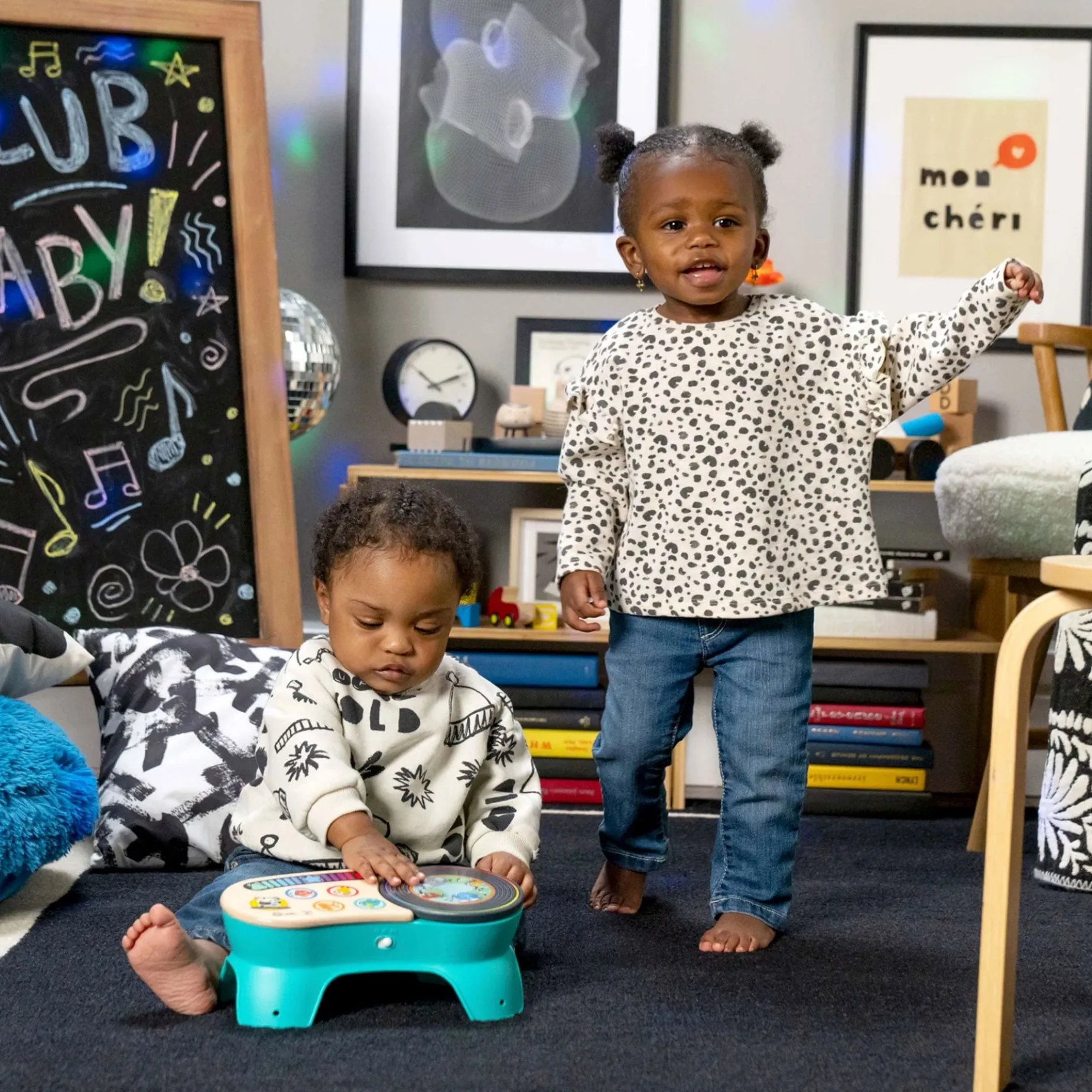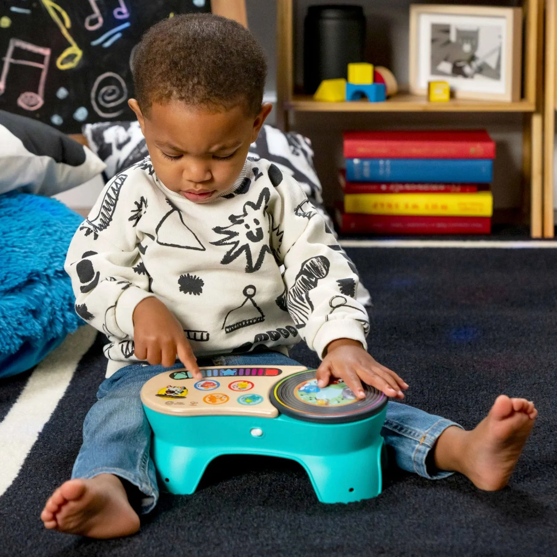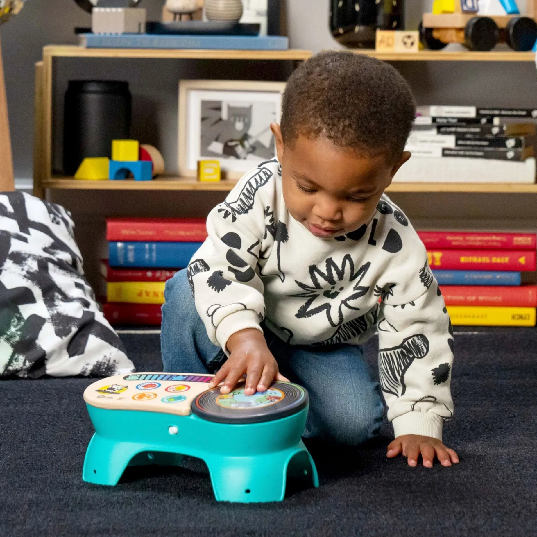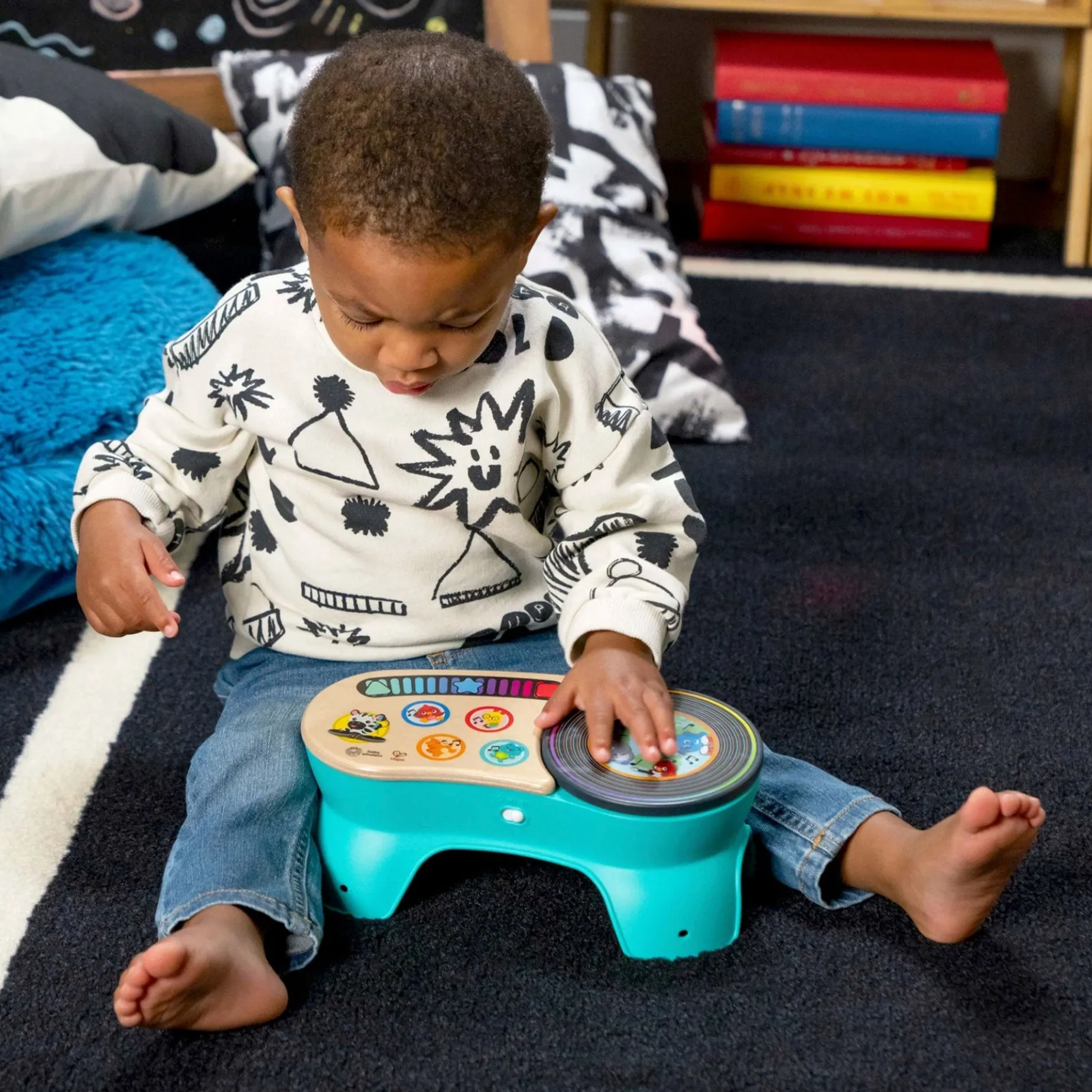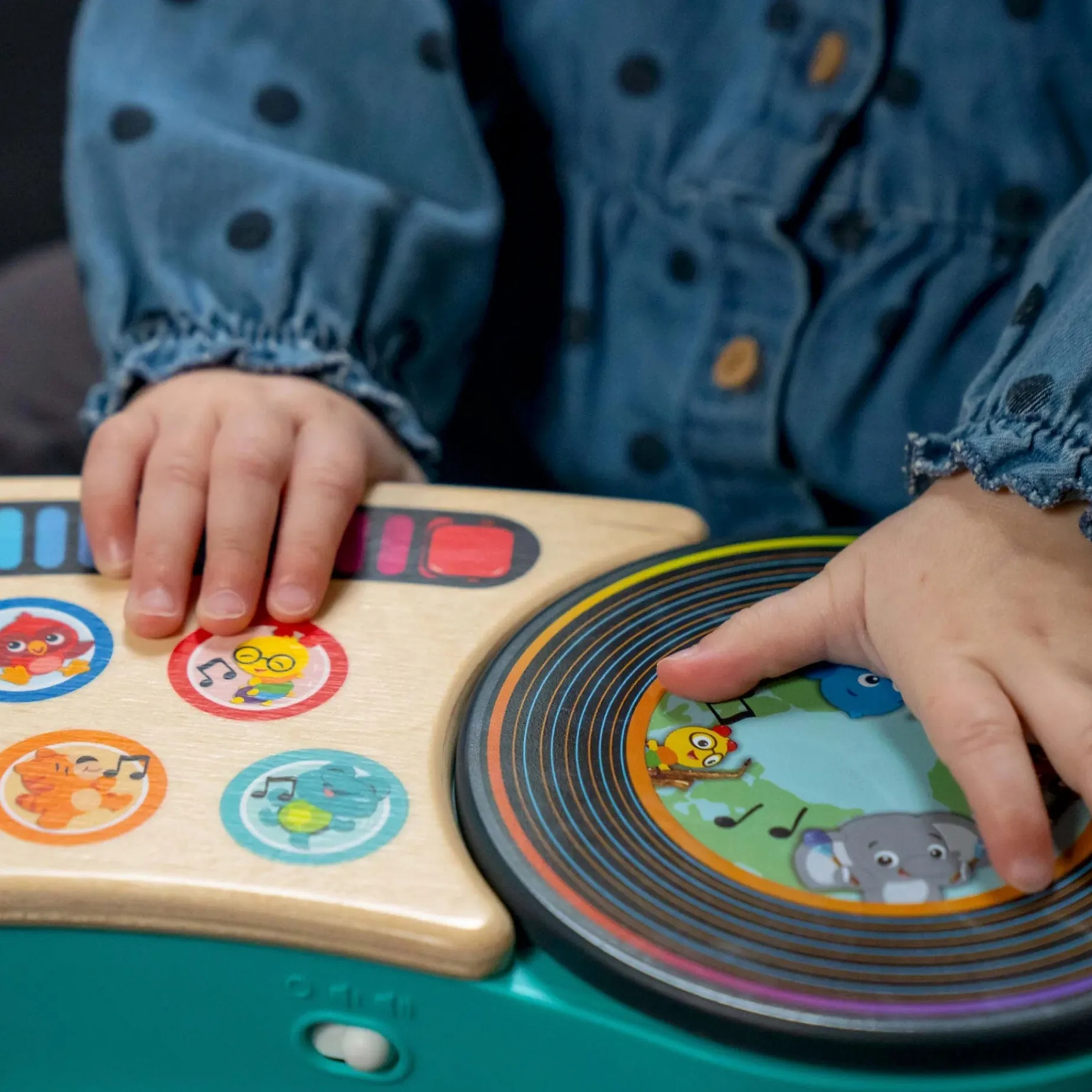 Make music, explore sounds, and learn rhythm with the Baby Einstein + Hape DJ Discovery Magic Touch Turntable. 50 melodies and sounds let baby put their own spin on songs and support fine motor skills. Baby will love to dance and explore music with this musical toy that rewards baby’s curiosity with every tap and turn. Magic Touch technology helps baby make music easily and promotes cause and effect discovery. Featuring FSC-certified wood, baby can pause and play pre-recorded melodies, blend melodies, or spin the record to speed up the tempo — just like a real DJ! On-key sounds help every tune sound great, and volume control makes music fun for everyone!