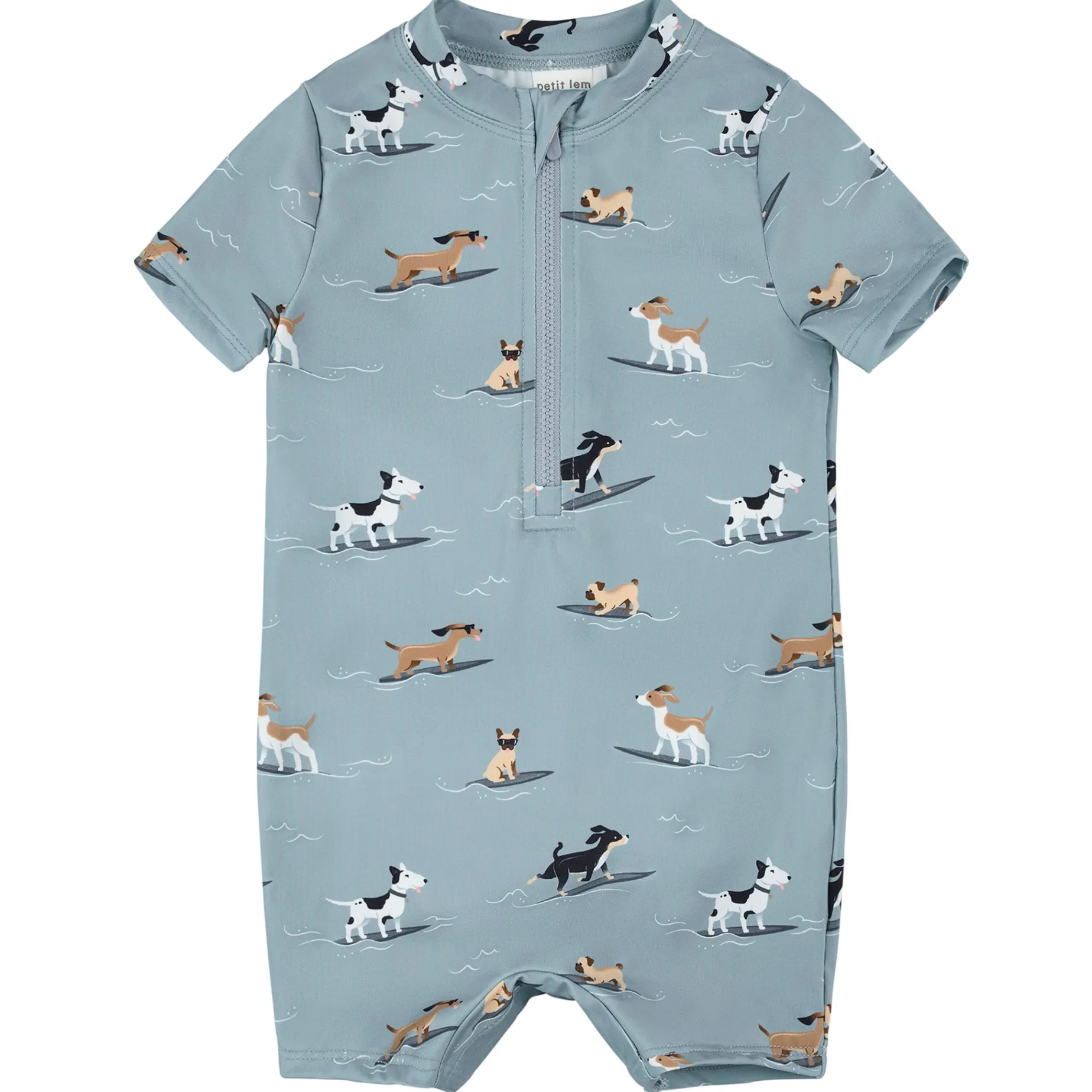 This sweet swim romper has an adorable Surfing Dogs print your little one will absolutely love. With a soft and stretchy fit, the quick-drying swim romper gives him the freedom to wiggle splash and play through the water and sand. The playful piece is easy to pull on and off thanks to the zip on the front and with built-in UPF50+ sun protection, nothing has to get in the way of your busy little adventurer.