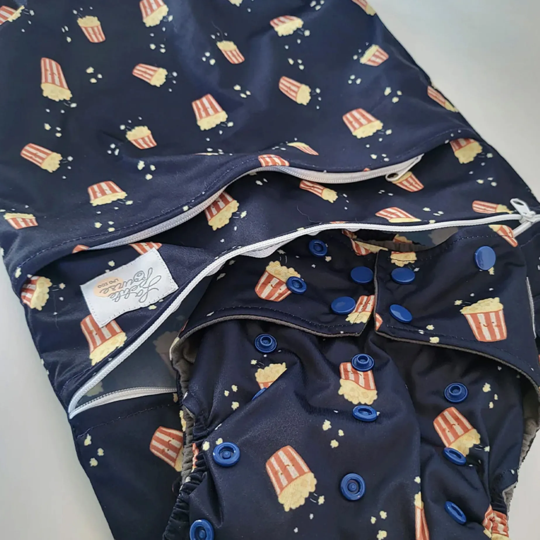 This bag has two openings that allow you to store 10 diapers. It’s very useful for outings: you can store your wet swimsuits, take your diapers to daycare, and dispose of your soiled diapers. A must-have to add to your cloth diaper order!