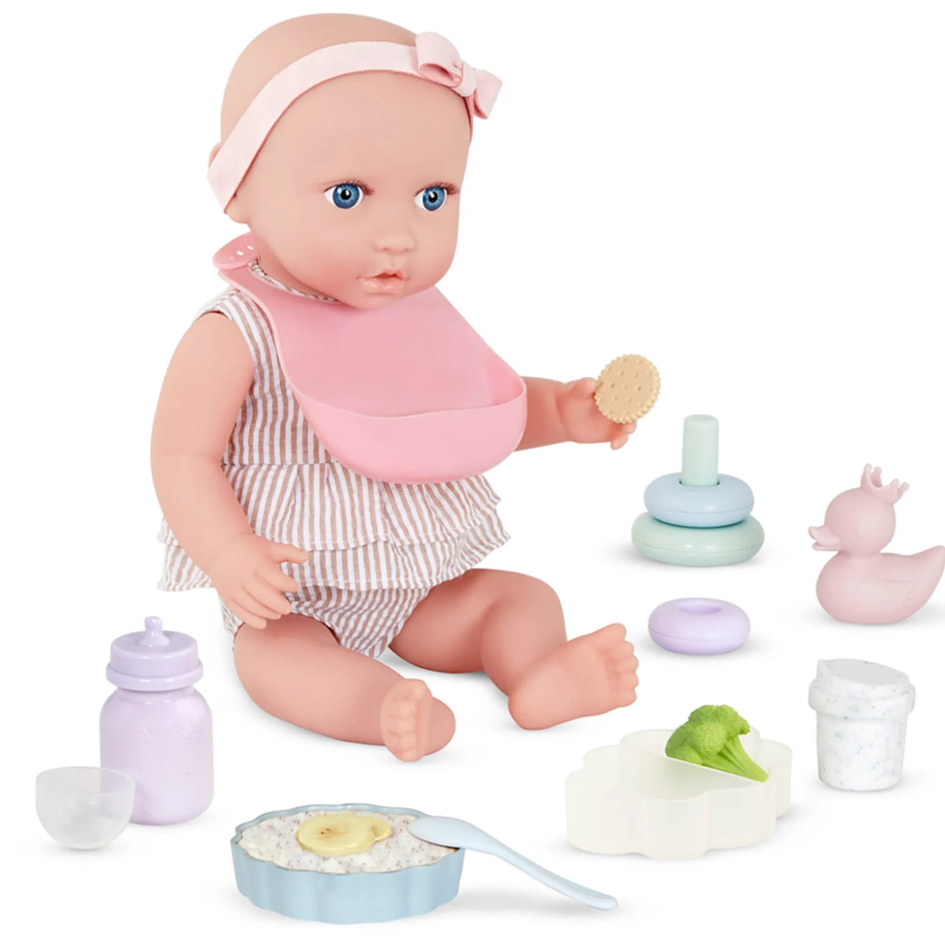 Includes: 1 bib, 1 bottle with lid, 1 oatmeal bowl with bananas, 1 snack container with lid, broccoli, 1 cookie and 1 spoon, wipes, duckling, diaper, etc.