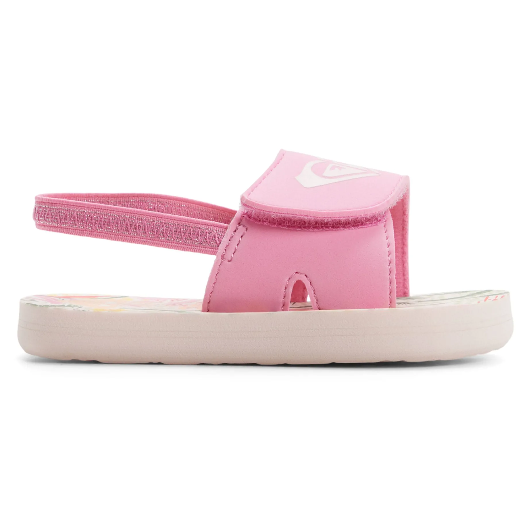 Keep your little one steady on their feet with the FINN sandals. The cute pink FINN sandal features a synthetic upper and an elastic back strap. The soft EVA footbed has a Roxy graphic print with a white floral pattern. The outsole is made of Rubberlon.