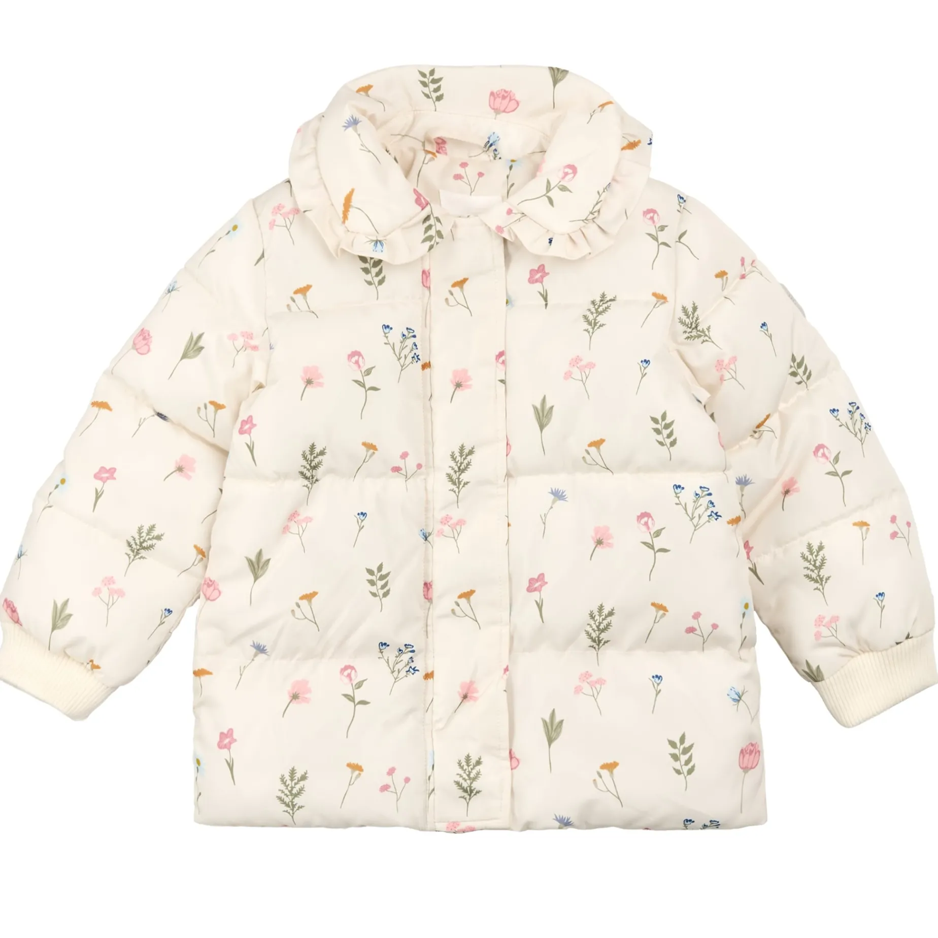 This floral puffer jacket is the perfect outfit to transition into the colder months. It features a floral vine print and a pretty ruffled collar. While keeping summer vibes for fall, the jacket includes ribbed cuffs and a zipper guard, perfect for staying warm on cooler days.