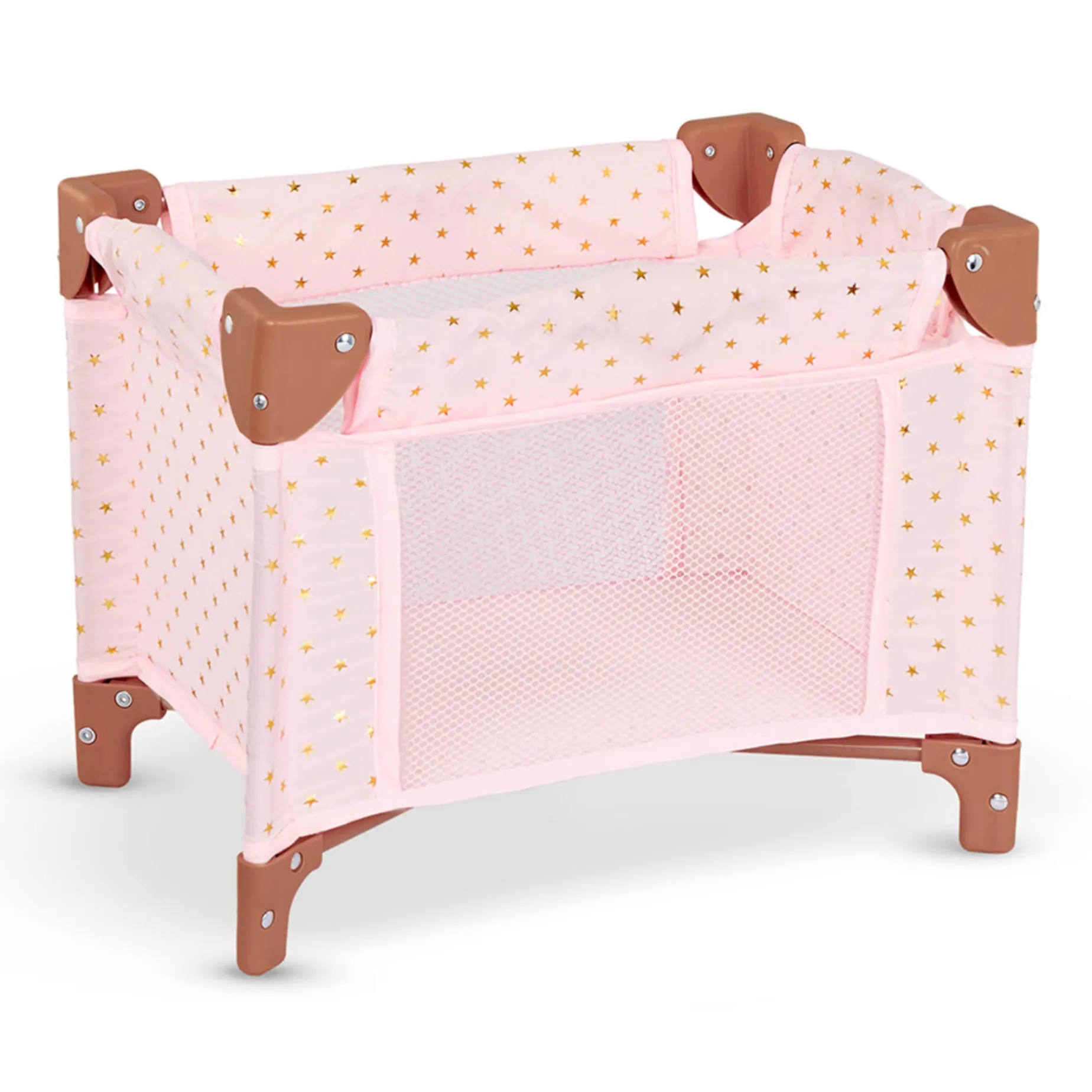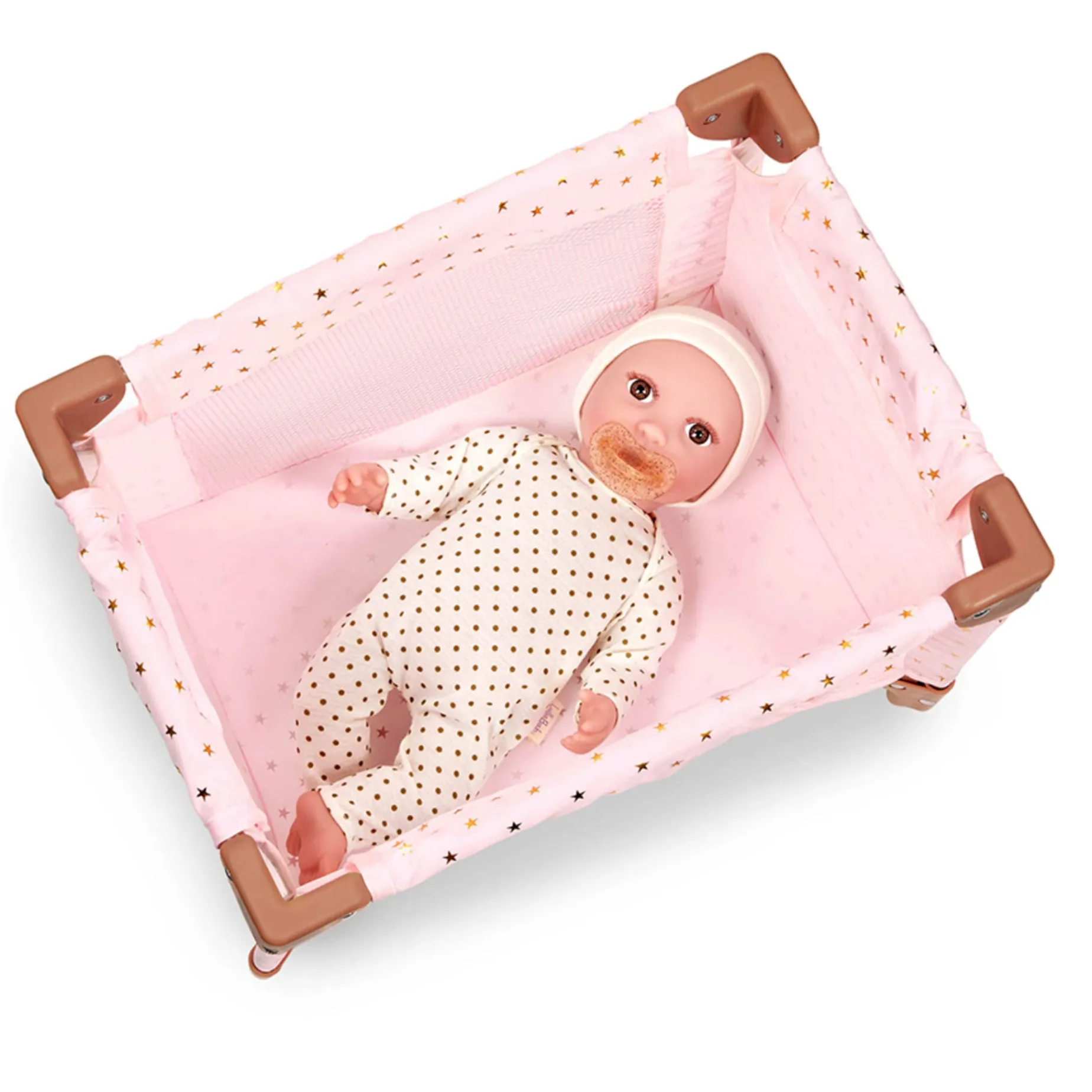 Give baby dolls a lovely place to dream and play with the beautifully designed LullaBaby playpen. Featuring a stylish, golden star-print pattern, this modern playpen fits most 14-inch baby dolls comfortably and easily folds down for convenient storage. Measuring 13” (H) x 6” (L) x 5” (W), the playpen is sturdy, lightweight and durable for everyday play. And it’s also a great way to role-play nap and bedtime routines with little ones. Young nurturers will love creating a nursery in their favorite play areas or just keeping baby doll bedside during the night. Comes fully assembled. An adult just needs to unfold and click everything into place. This LullaBaby doll accessory is safety-tested to meet all BPA and phthalate requirements.