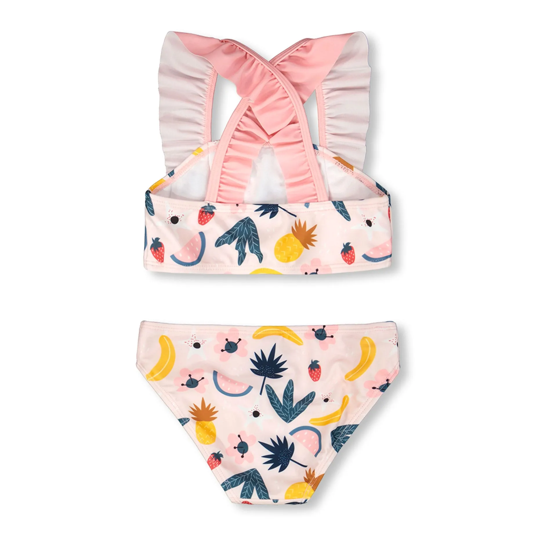 The two-piece swimsuit in pink with printed fruits is a playful choice for sunny days. This bikini set features a fruit print with pineapples, bananas, and watermelons, while the top is enhanced with wide ruffled straps for a fun and feminine look. Made from recycled polyester with added stretch, it blends comfort, durability, and charm for beach adventures.