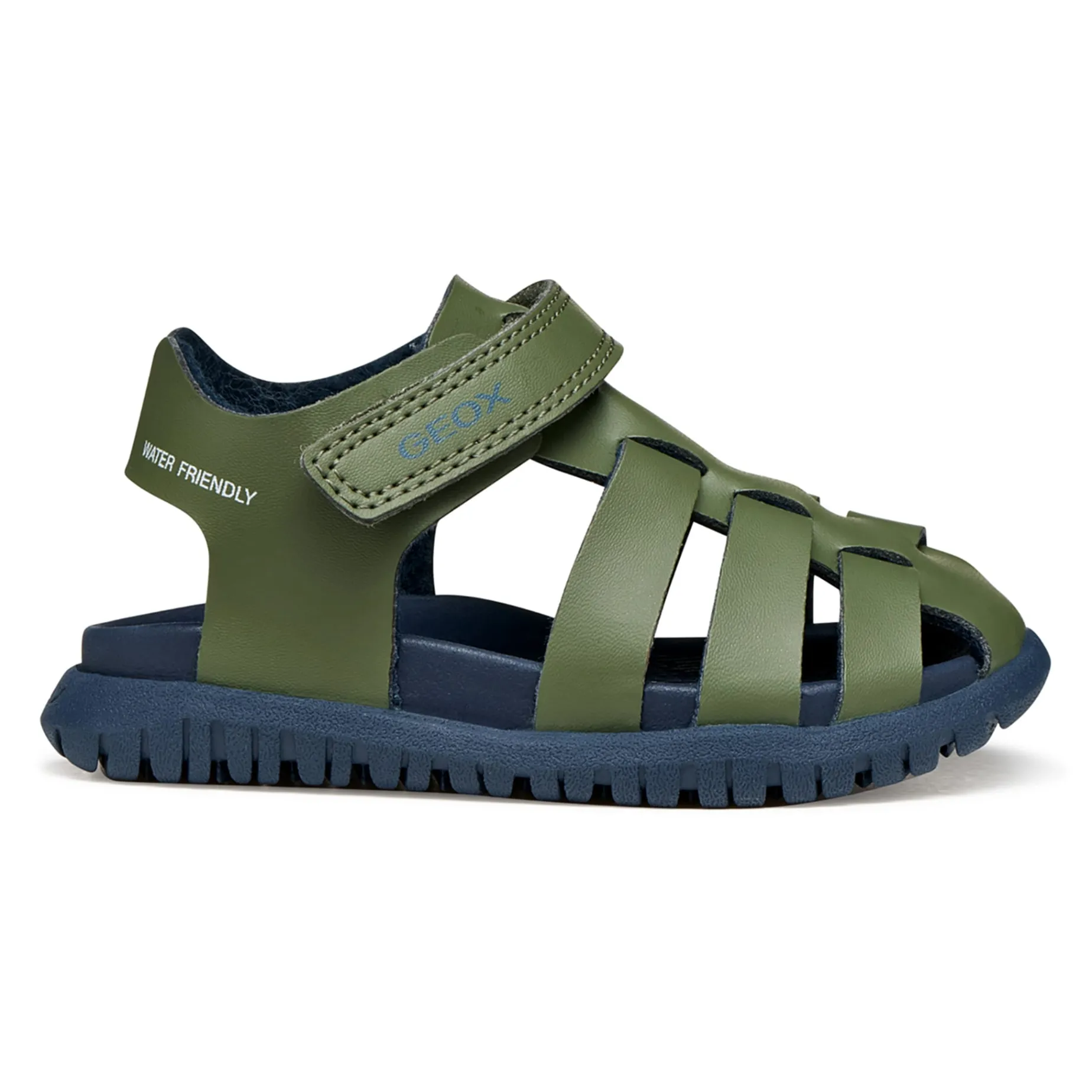 Comfortable lightweight open-toe sandal for boys with a modern dynamic design. This version of Fusbetto will prove to be a perfect partner for outdoor activities in warm weather. Crafted from a leather-effect material, this water-resistant flexible piece of footwear is easy to adjust and will provide children with all the freedom they need to run and play.