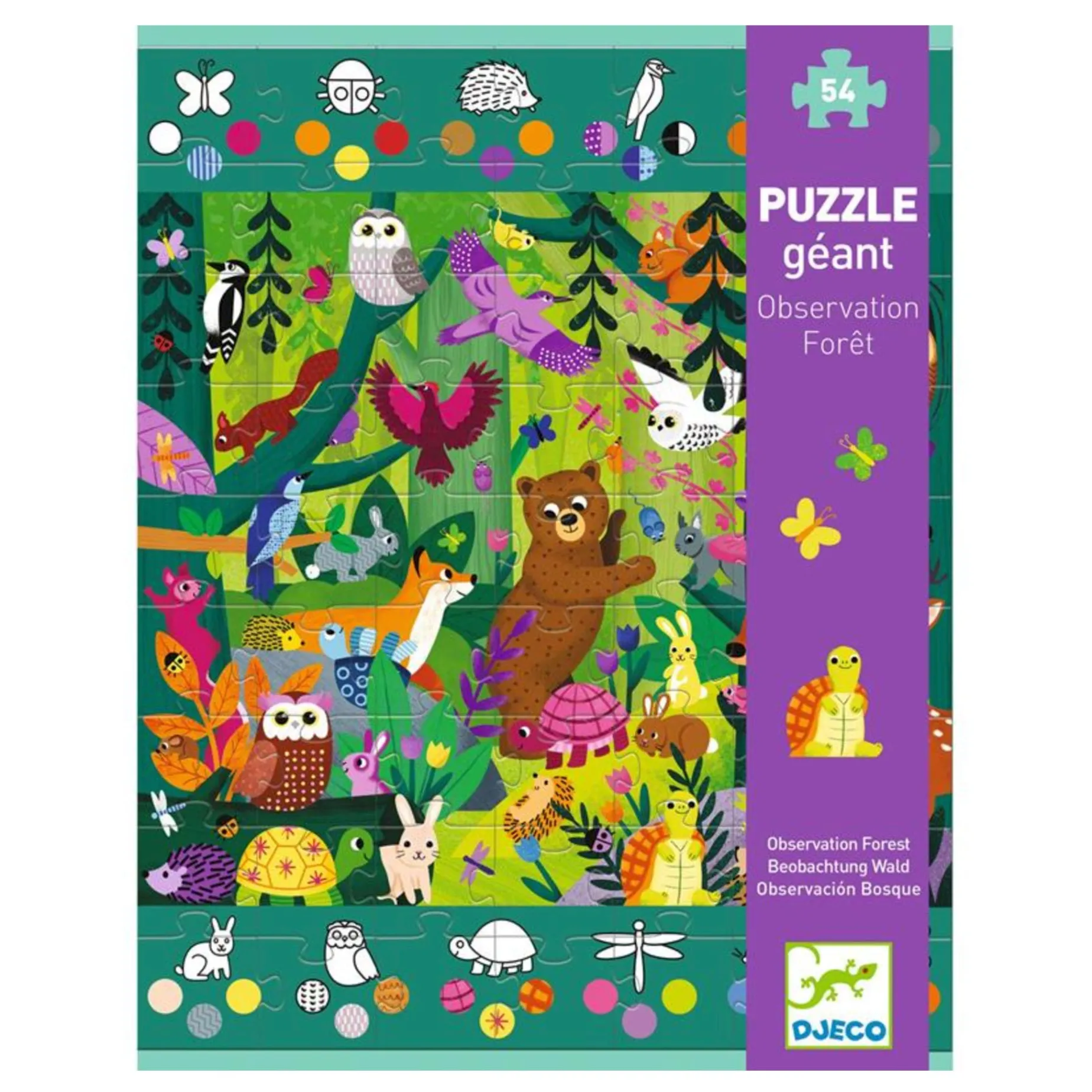 A giant puzzle, but that’s not all! Once you’ve built the puzzle, you’ll uncover a “seek-and-find” game where you need to find the animals in the colours shown. A puzzle and an observation game.