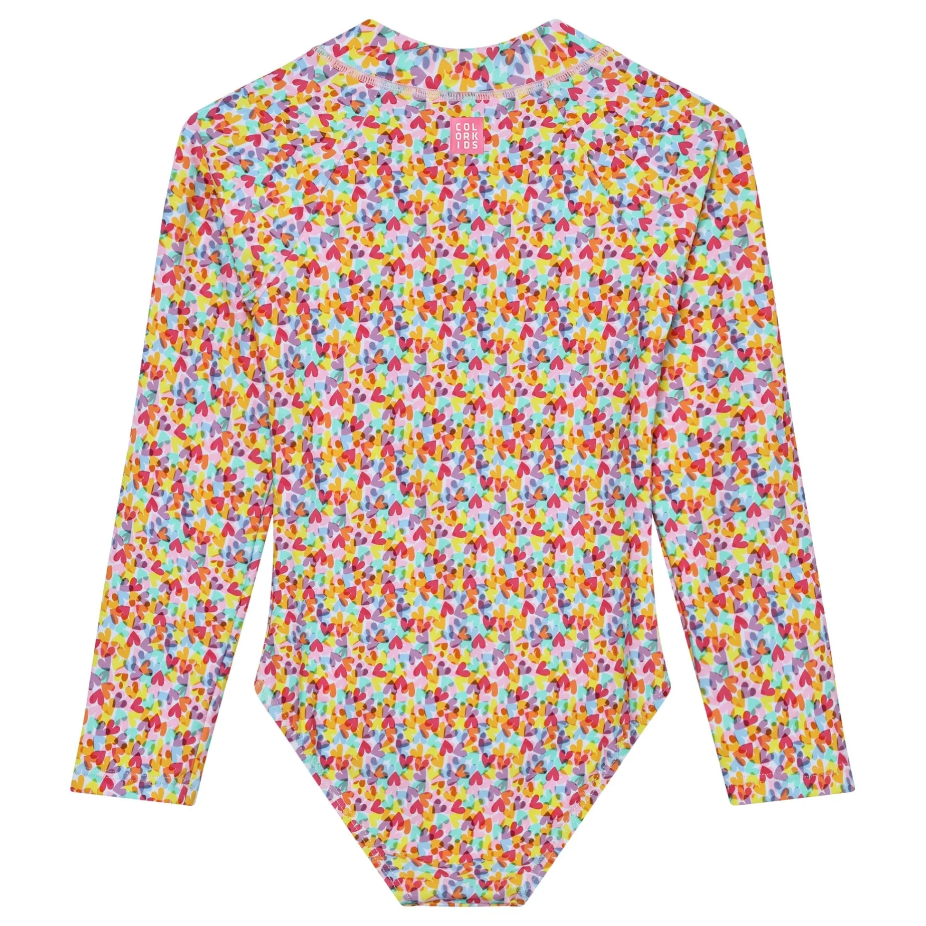 OEKO-TEX® STANDARD 100 Cert. No. 2276-364 DTI, Tested to UV STANDARD 801 UPF 60+ Long-sleeved swimsuit from Color Kids. The swimsuit has an all-over print. It closes with a front zipper and has a small fabric guard at the collar for extra comfort. Certified acc. to OEKO-TEX® STANDARD 100 Cert. No. 2276-364 DTI Tested and certified acc. to UPF 60+. To determine the UPF rating, the fabric is tested in both new and used conditions, following the UV STANDARD 801 method. The entire product is then CE-certified under PPE regulations.