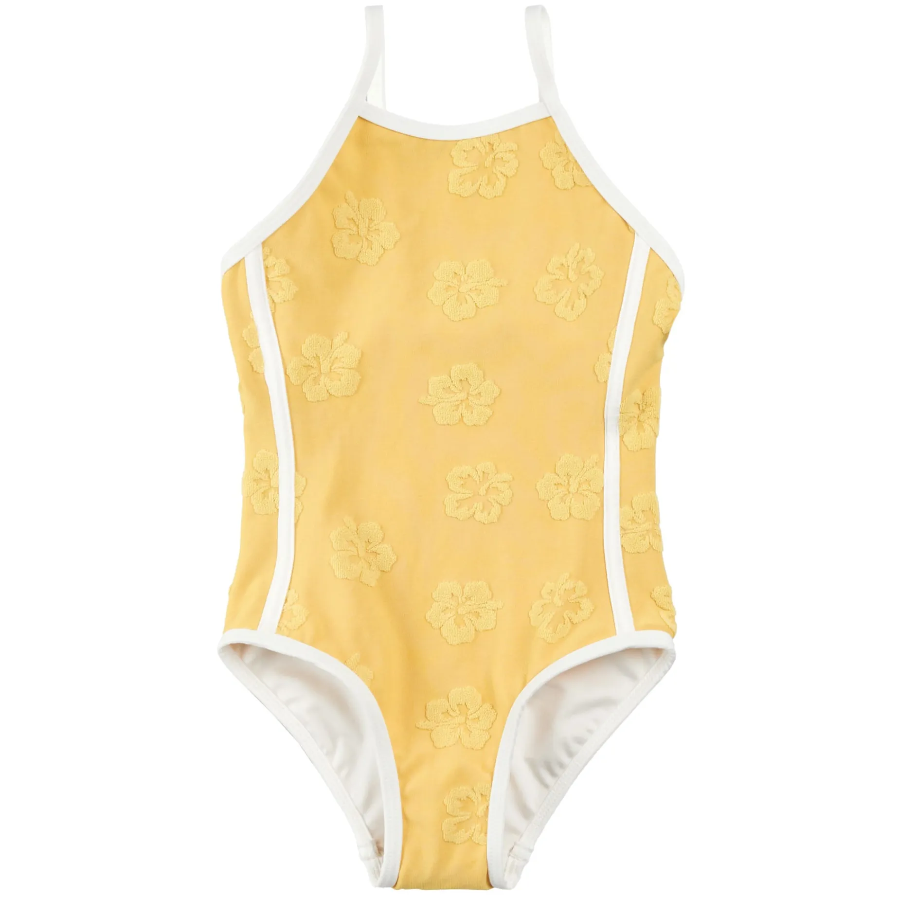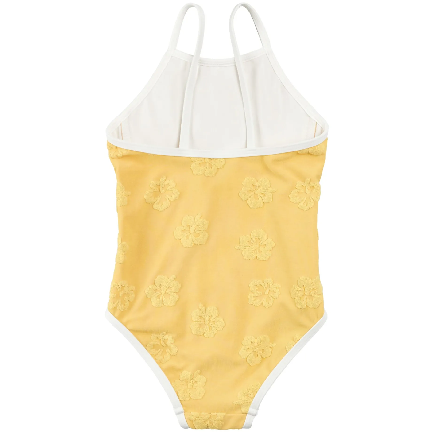 With its white hems and thin straps, this summer swimsuit has a sporty style and is made from a textured terrycloth material. Perfect for going to the beach or the pool, this soft yellow swimsuit with a subtle floral print will be a real ray of sunshine. Featuring built-in UPF 50+ sun protection, this swimsuit is both comfortable and protective.