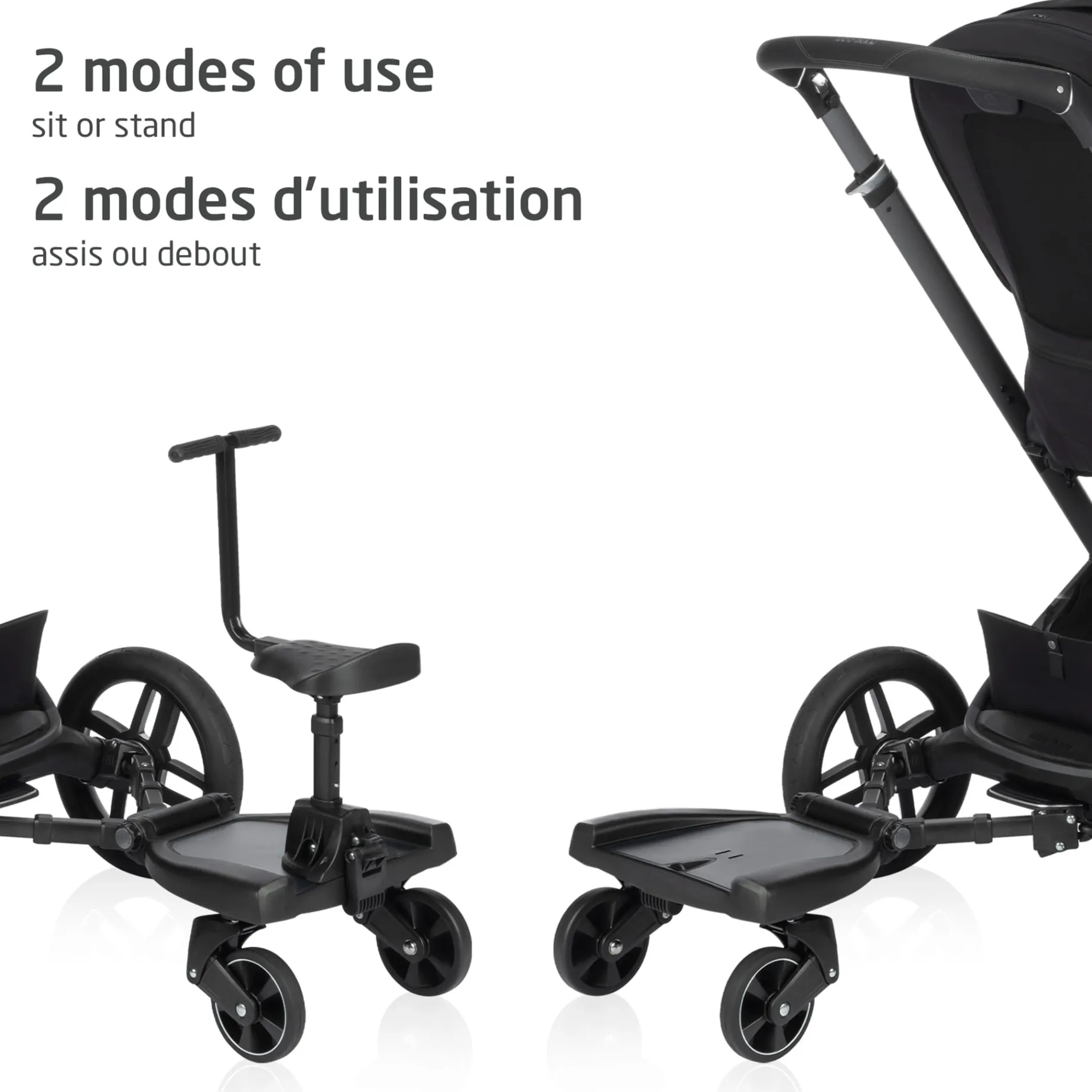 -[ROOM FOR TWO] – The Hop-on Board lets your toddler join the ride, while your little one relaxes in the stroller.