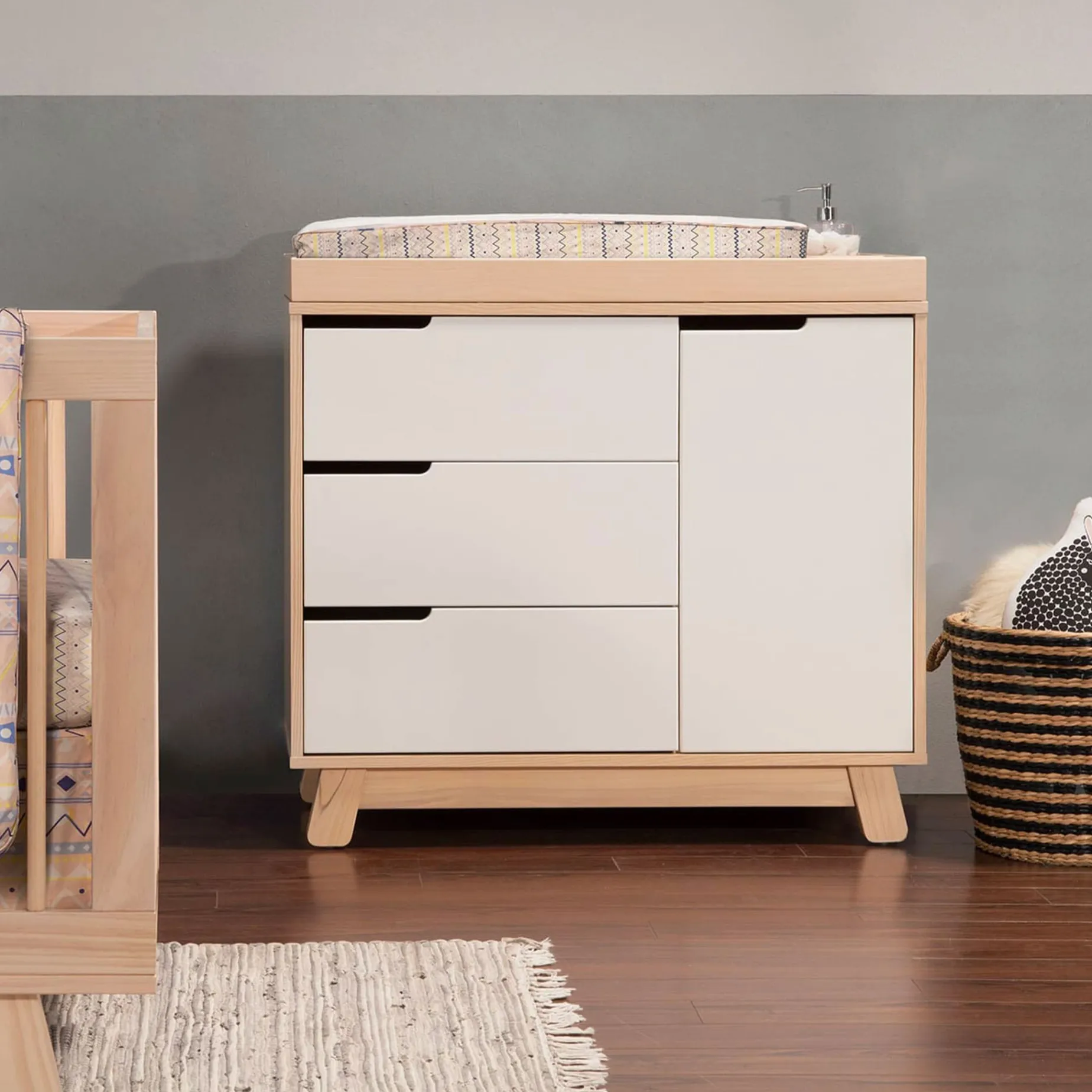 The Hudson 3-drawer Changer Dresser is a modern space-saving convenience! Combining an included changing table, 3-drawer dresser, and storage cabinet all in one versatile package. Truly built for baby, the storage cabinet includes an adjustable shelf which is perfect for keeping diapers and wipes handy. Additional details include smooth-glide drawers, hidden hardware, and an included anti-tip kit. Complement the best-selling Hudson 3-in-1 Convertible Crib for an essential modern nursery.