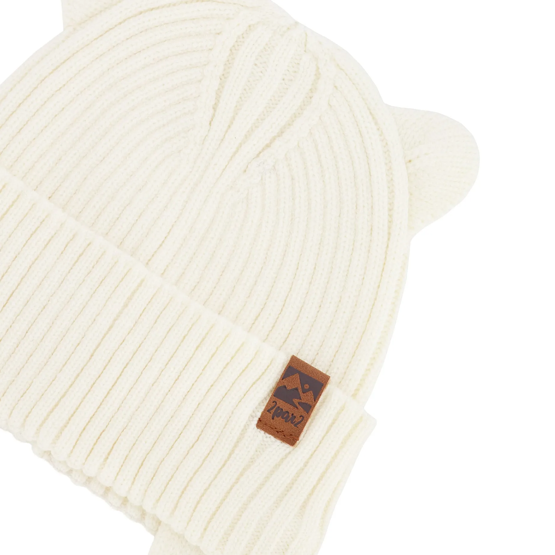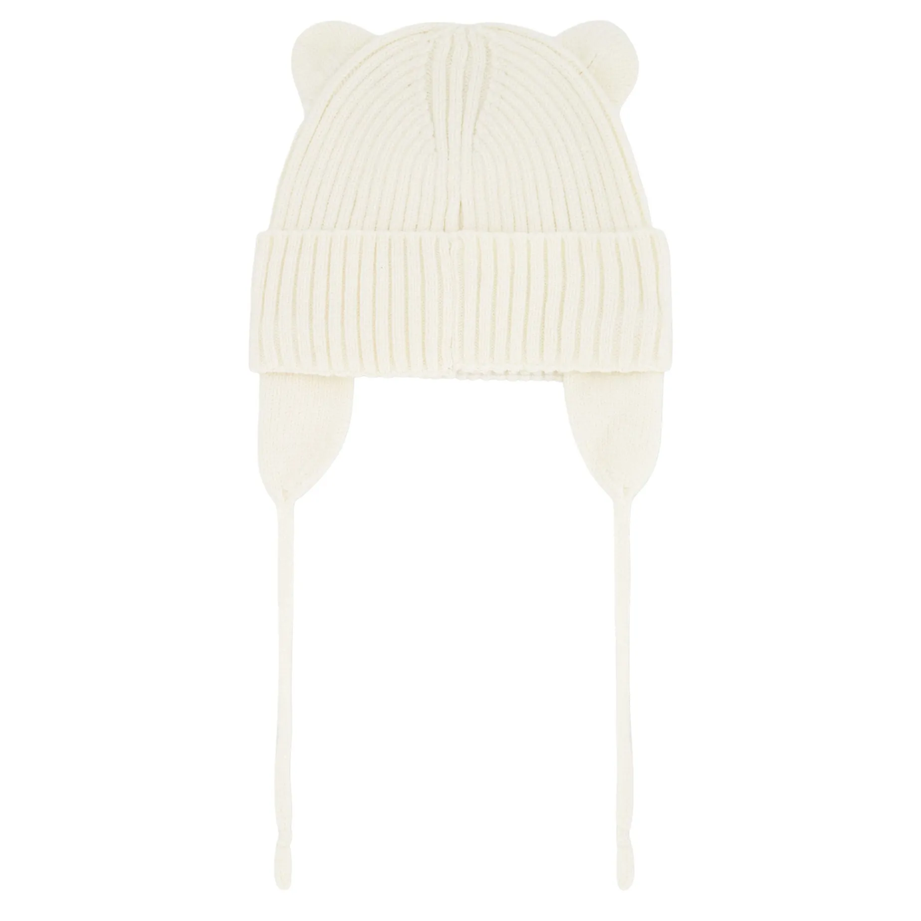 This adorable off-white baby knit hat is a sweet blend of comfort and charm. Crafted from a soft ribbed knit mix of viscose, polyester, and nylon, this cute cold weather accessory offers gentle warmth while being breathable for baby’s delicate skin. Cute 3D rounded ears add a playful touch, while the adjustable ties keep the hat securely in place. The turned-up brim features a small logo patch, giving it that classic Deux par Deux signature style.