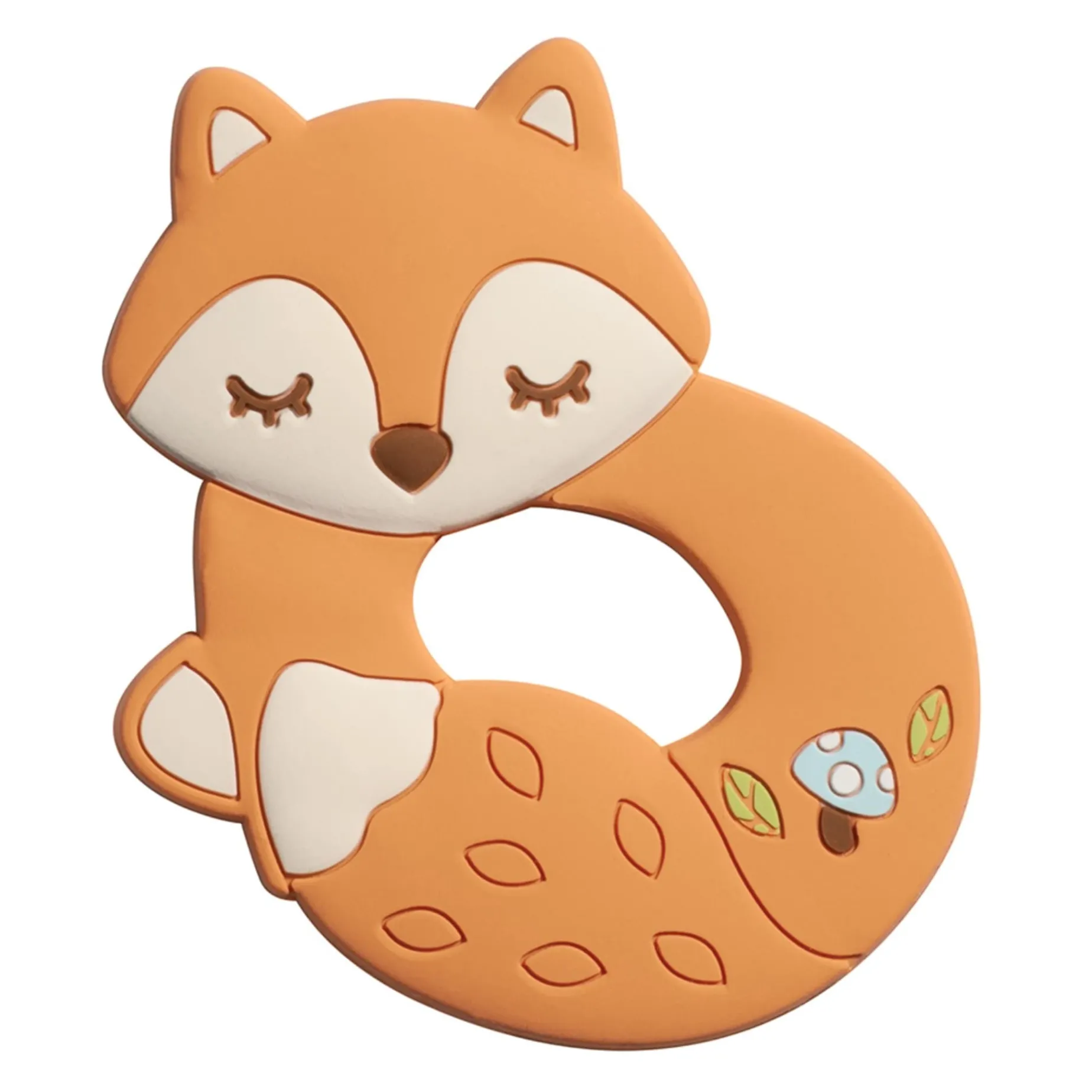 Baby can have a woodland friend of their very own with our Jordan the Fox Silicone Teether toy! The soft and safe 100% silicone material of this gentle teething ring lends an appealing texture to ease your little one’s discomfort. An easy to hold design and rounded shape encourage the development of early motor skills. Jordan’s small, triangular ears and large, white-tipped tail come together to create the familiar look of this beloved forest animal. Embellished with a tiny, blue toadstool and a pair of green leaves, this whimsical teething toy is the perfect companion for the littlest nature lovers!Â