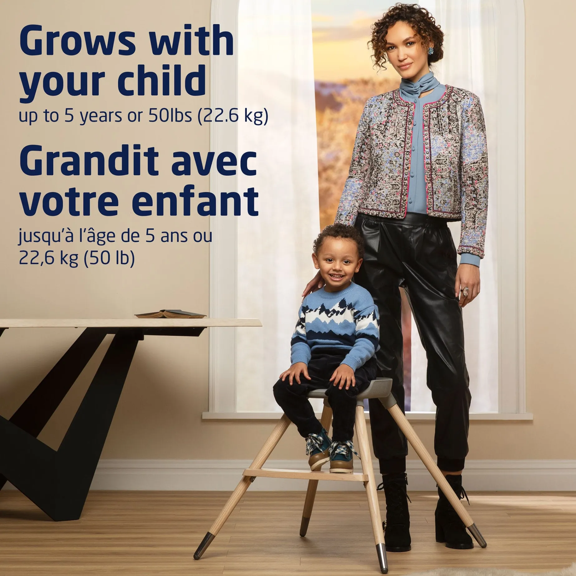 Built for safety and stability, it features a 5-point harness with 2 shoulder strap heights, a protective anti-scratch base, and sturdy wooden legs with anti-scratch leg caps.