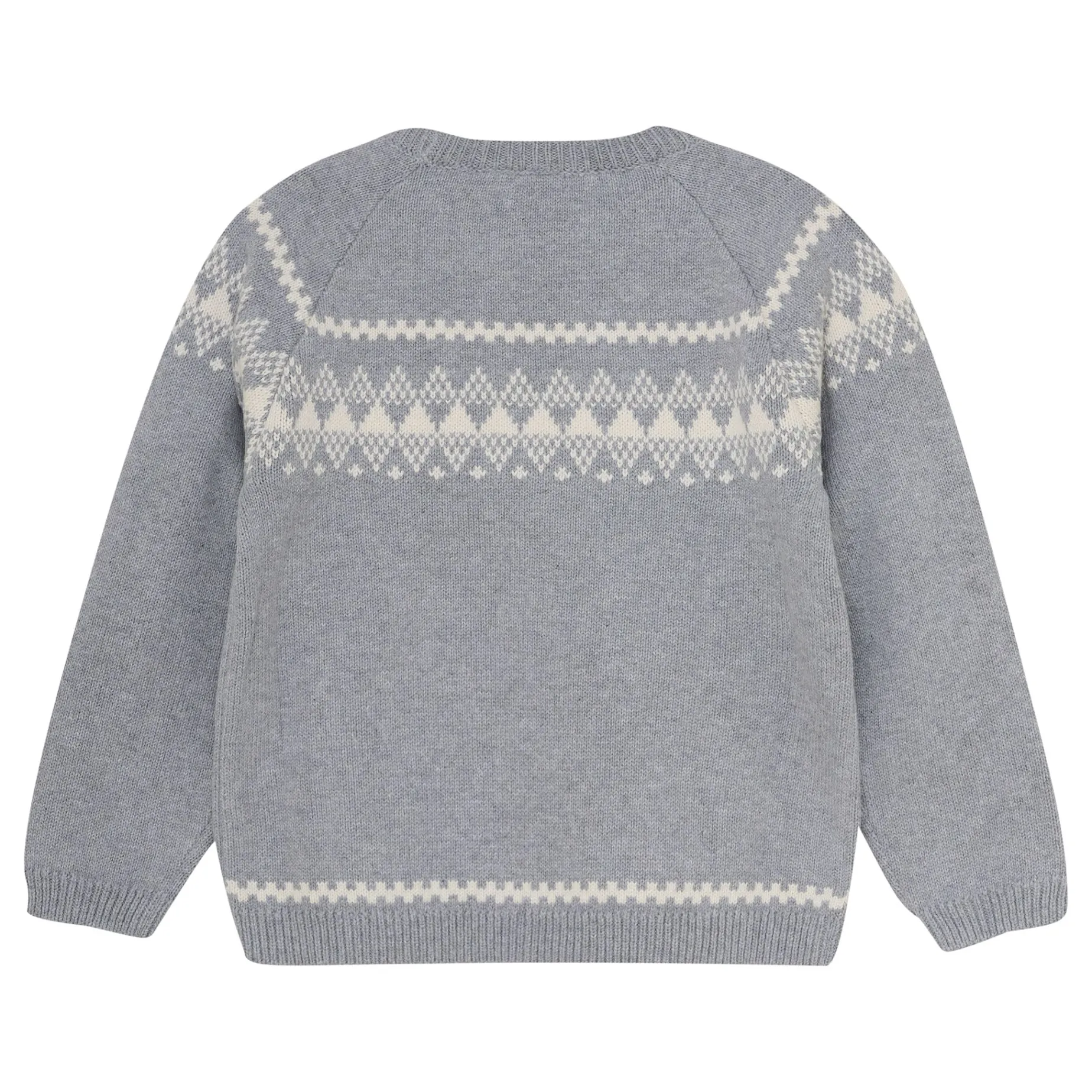 Beautiful knitted sweater in a soft and warm wool blend with a detailed jacquard pattern extending across the chest and continuing onto the sleeves. The design features a round neckline and ribbed edges at the sleeves, neckline, and hem, ensuring a comfortable fit and stylish look. Ideal for everyday wear and special occasions during cooler months.