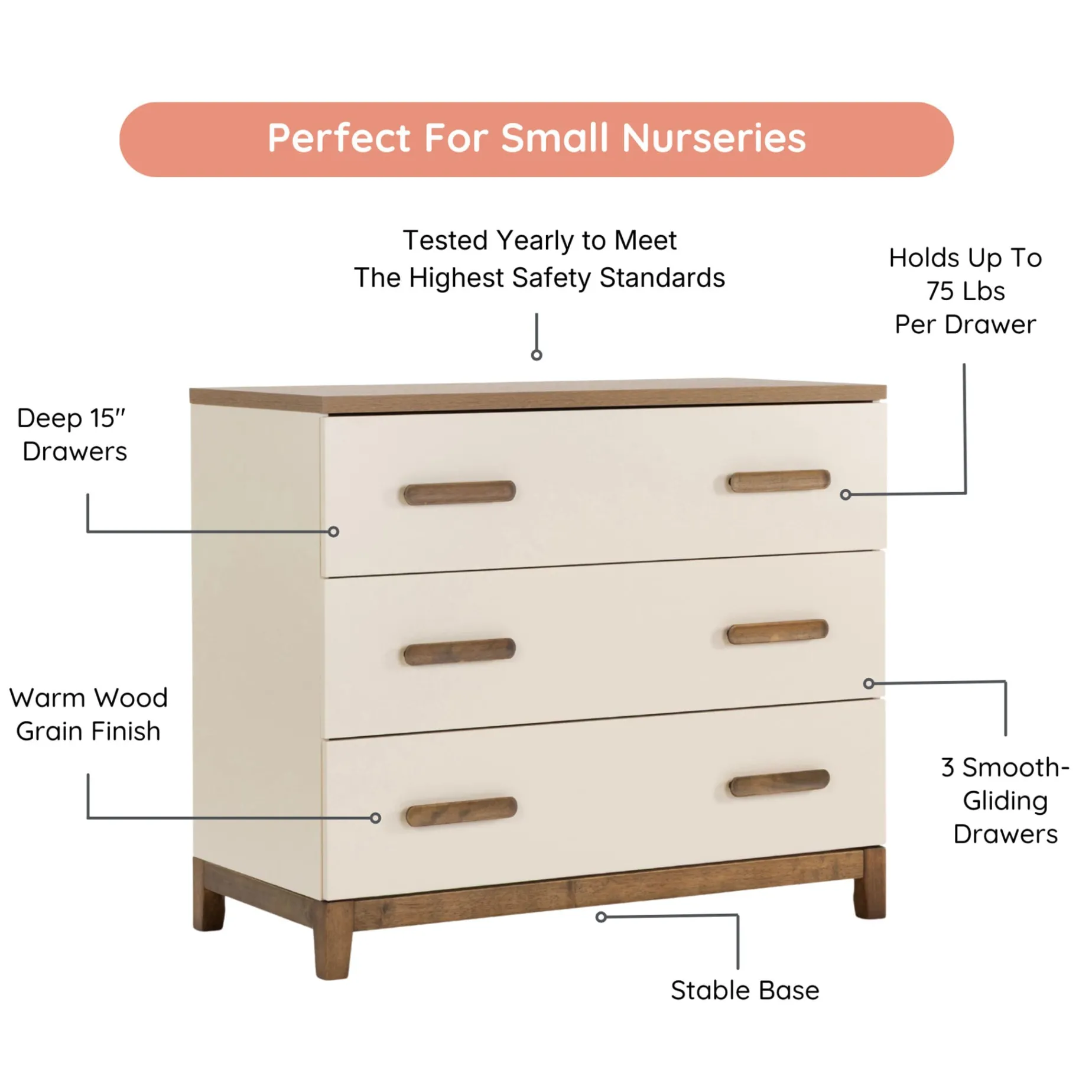 When you need to maximize storage in the smallest spaces, the 39” LaLa Little 3-drawer Dresser is your small-in-stature, big-in-storage solution. With three deep drawers that make the most of limited square footage, it pairs perfectly with the LaLa 3-in-1 Convertible Crib in White to create organization and flow in even the most compact nurseries. Durable melamine and rubberwood handles and legs are built to withstand bumps and scratches, and anti-tip hardware helps keep everyone safe. Get the storage you need and the style you crave – all within the space you have.